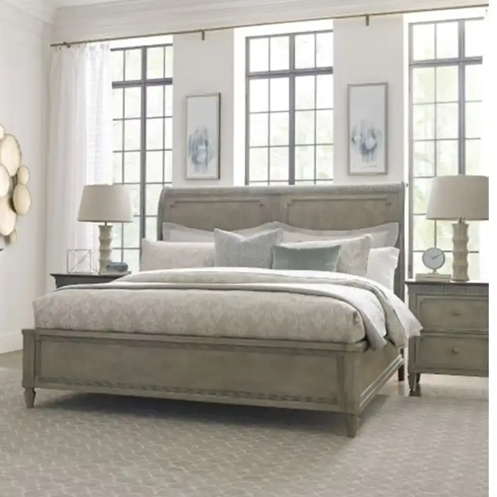 Beautifully framed sleigh bed with reeded top rail and low profile footboard will be the focal point of any bedroom. Available in Queen, King and California King.