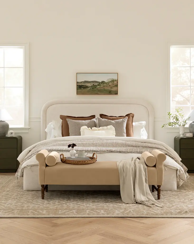 With an alder wood frame upholstered in your selection of exquisite fabrics, the Selby Bed is a unique take on the modern bed frame. With a rounded shape and a playful feel, the Selby frames pillow vignettes with ease, elevating your bedroom styling.