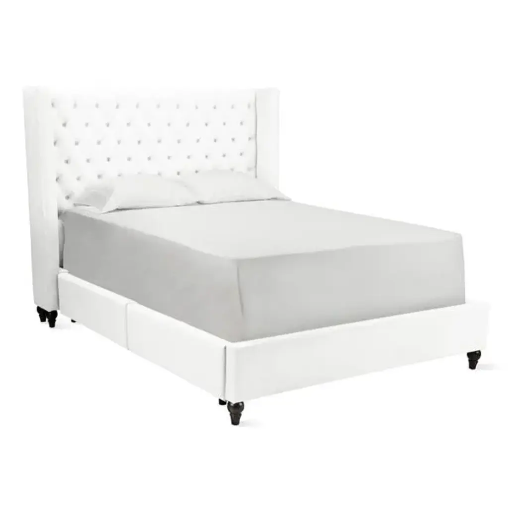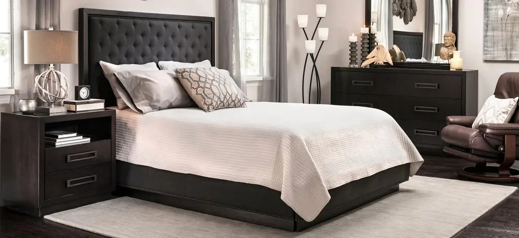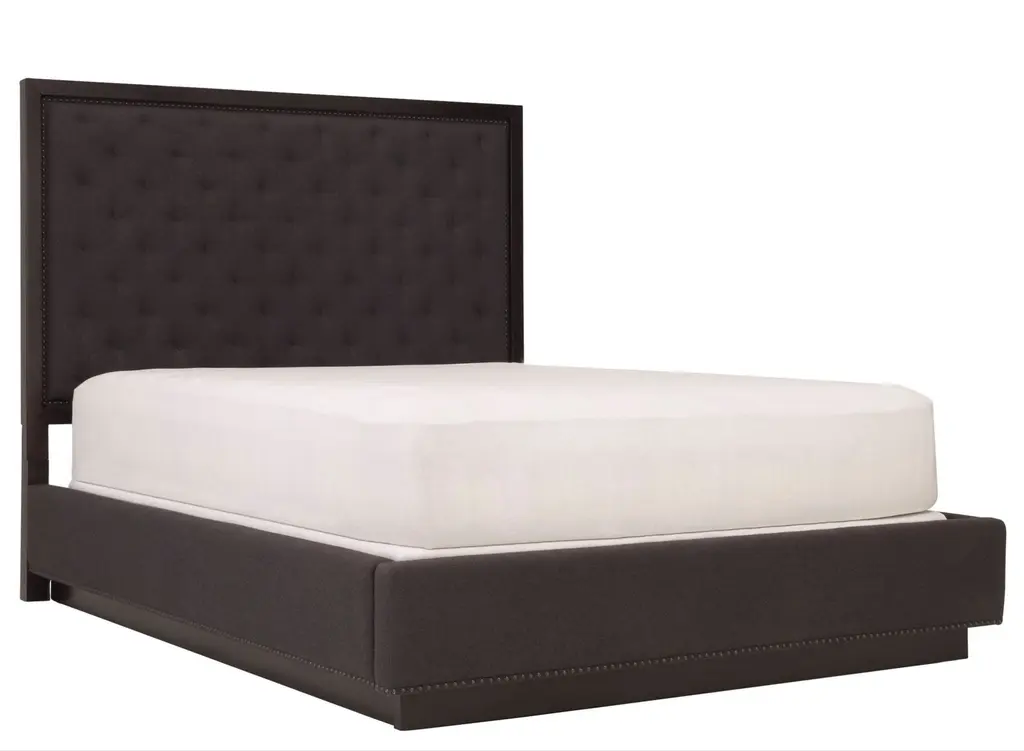 The Senza queen bed is a real beauty with its dark charcoal wood finish and graphite upholstery. It features a lovely polyester upholstery with fashionable button-tufting on the headboard. Its clean-line silhouette makes a lasting impression.