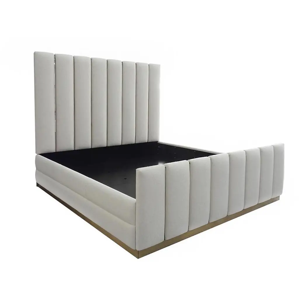 The Serafina King Bed is a gorgeous contemporary statement piece that communicates subtle depth and lavish charm. A sturdy beech wood frame is upholstered in Naima Parchment 3041 fabric, giving the piece a neutral silver-gray color that plays beautifully with Valyrian Gold trim along the base. Gorgeous channeling at the headboard and footboard showcases slender accents of clean silver eglomise, playfully contrasting the gold base.
