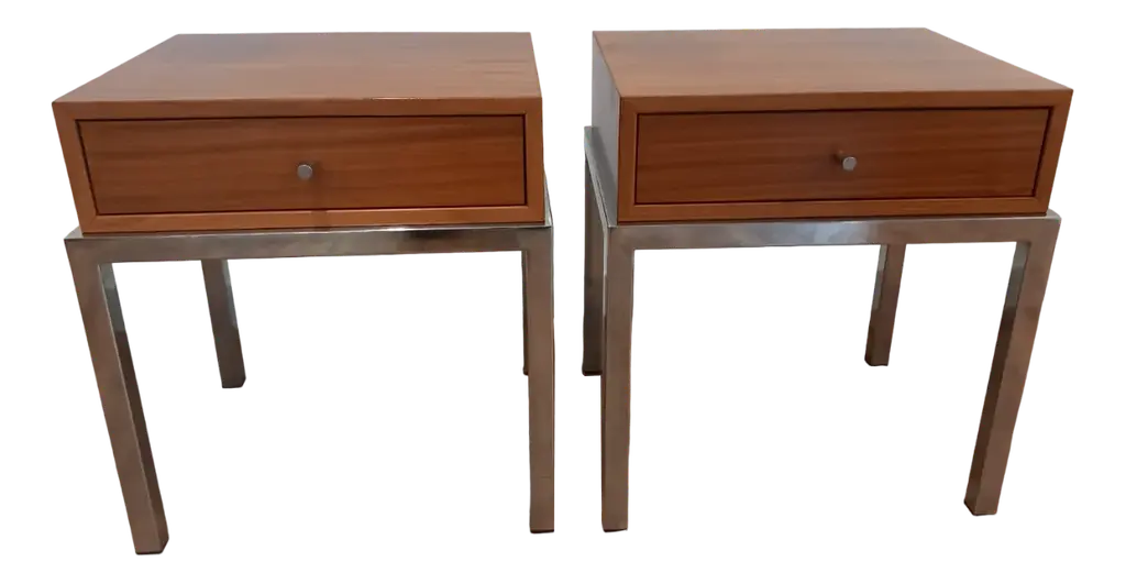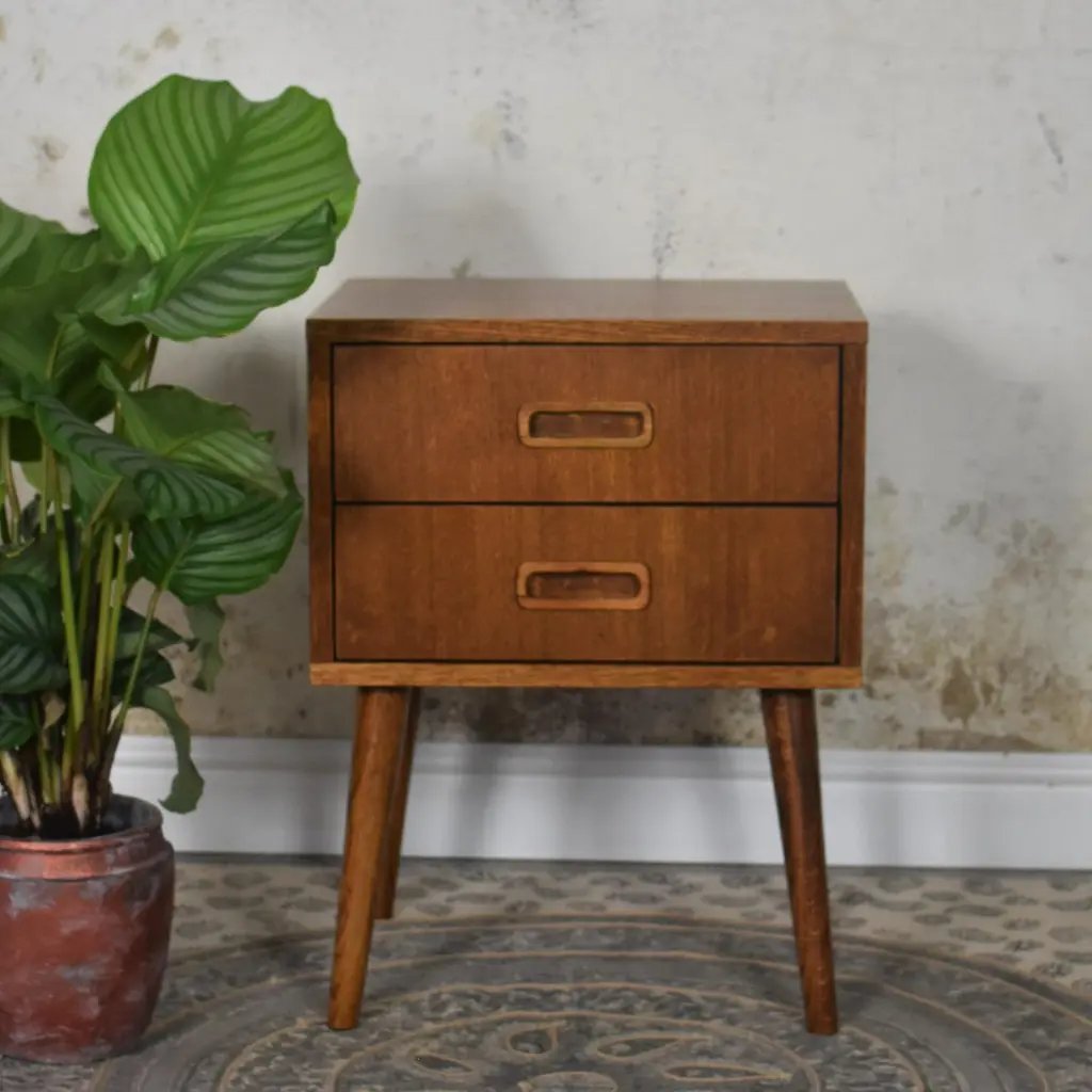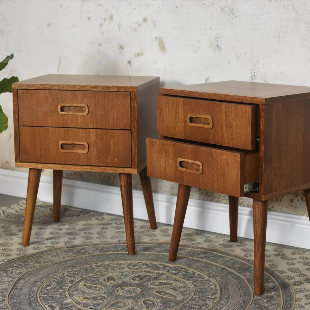 Set Of 2 Runo + Bedstands by PastformDimensions: D 35 x W 45 x H 60 cm.Materials: Stained and varnished wood.Available in different wood color finishes: Whiskey, Rum, BPA, Nobel, Brandy, Schwarz, and Natura. Please contact us.Rooted in a good traditionThe Pastform Furniture studio dates back to the 1990s. Having in mind the idea of a traditional family company, Dawid Gełeta established a carpenter’s shop in 1997. The company specializes in the manual production of utility furniture. Times have changed and with them, fashion has changed. In 2016 we decided to change the direction, following the growing demand for vintage furniture.My name is Mateusz Gełeta, I am the son of the carpenter who founded the company. From an early age, I have watched my dad’s work. He put his whole heart into creating furniture, polishing every detail with his strong hands and making sure that nothing escaped our attention before sending the product to the customer. He made sure that every piece of furniture was perfect and refined. We remain true to these principles.Following the blow, I decided to create a harmonious combination of modern quality with the classic style of the 1960s. This is why I designed and created a unique collection of wonderful furniture, which, in addition to its well-thought-out functionality, also creates a perfect design and composes original arrangements.The golden age of interior designIn the 1960s interiors used to take on a very characteristic touch. All over the world, this style was called a mid-century modern, locally it was simply – retro furniture. Simple, elegant minimalistic form, without unnecessary decorations and splendor. Decorating with the idea of an uncomplicated composition, it allows for an undisturbed selection of the arrangement accessories and emphasizes a high level of functional comfort. One might say – a perfect piece of furniture. Comfortable, hiding surprisingly many items despite quite neat dimensions, made of noble species of wood and created by hand, with a focus on carefully refined details. No wonder its popularity is growing so much.Unique, refined, with a soulEach piece of the Pastform collection represents a unique style. Thoughtful concept of usable comfort, refined details, carefully selected raw materials, and proven accessories. We use only high-quality boards which we veneer with oak, American walnut, and other durable wood species. They are carefully oiled with the best, hard, ecological oil waxes, giving the furniture its final shape. This technology brings out the natural beauty of wood, exposes the grain and unique design of each piece, highlights the beautiful color, and allows to achieve timeless durability.This is how unique, thoughtful, and refined furniture with a soul is created.Thinking about futureWe are trying to positively create the world of which we are a part, contributing to a better tomorrow. We cooperate with local suppliers, support small companies and production plants, care for ecology, and respect the needs of the land. We always strive to establish long-lasting, based-on-trust relationships with customers and contractors.Flexible, with openness and heart on handWe sincerely like what we do. Playing with the shape, structure, and texture of wood is fascinating. Creating new arrangements and coming up with innovations that will meet your expectations. We are proud of our products and we are happy to present you with our collection of refined furniture.All our vintage furniture can be made on request – fulfilling the boldest dreams and fantasies. See our offer and if you want to know more, feel free to contact us. We are waiting for you!