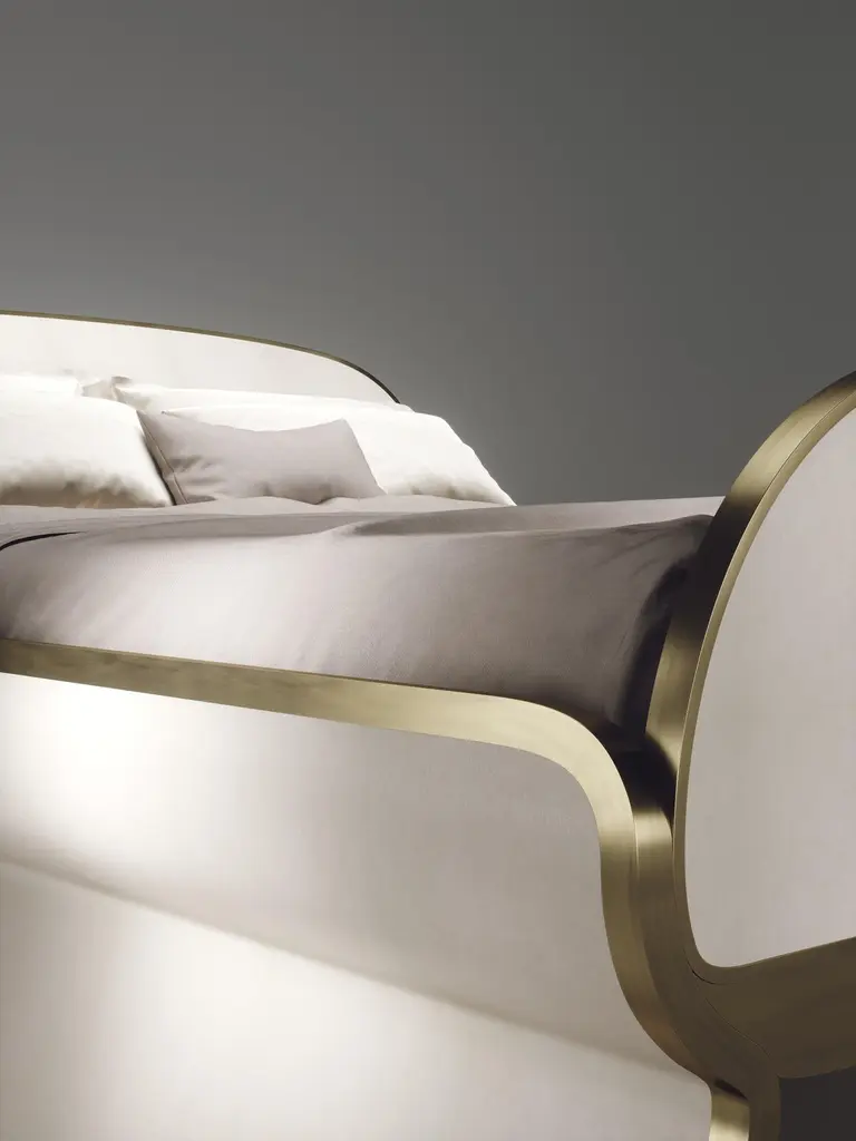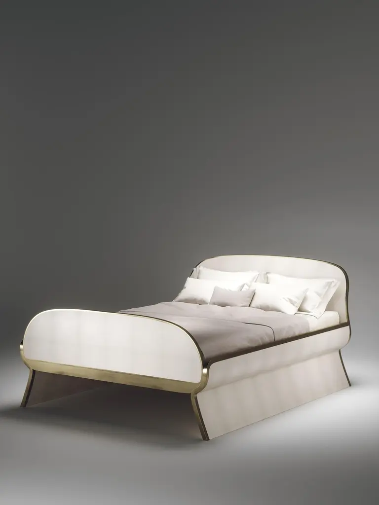 The Paris based label has distinguished themselves since their launch, with their iconic use of shagreen mixed with brass and other exotic materials. All furniture is handcrafted by skilled artisans, ultimately making each piece unique, designed in Paris and produced in the Philippines.The Dandy bed inlaid in light grey shagreen and bronze-patina brass is a one of a kind piece. This modern and elegant design creates a subtle and sculptural statement for any bedroom. This design comes in other finishes as shown in the image slides. The frame is sold without the mattress. Custom sizing available to suit any bed sizing. This piece is designed by Kifu Augousti, the daughter of Ria and Yiouri Augousti. The dimensions of this piece are 170 x 232.9 x 103.2 cm All Kifu Paris pieces are handmade by artisans, ultimately making each piece unique. Custom color/sizing available on request. Wipe clean with soft dry cloth.Although inspired by her parents, her collection of Home Accessories and Furniture is a distinct identity of its own. Kifu uses handmade techniques of elaborate inlay patterns of shagreen, shells, semi-precious stones, materials she experienced as a child growing up in her parent’s studio, but interpreted in a younger quirkier way reflecting her youth. From her "jewelry inspired knobs" on decorative boxes, gold bar boxes and an extravagant inlay pattern mix of shagreen and shell inspired by galactic constellations, as seen on her enormous round mirror, is refreshing to see. Kifu embodies whimsical elements throughout her collection and is not afraid to be daring and unexpected in her approach to design. All shagreen-covered items should be kept out of direct sunlight, color variants may occur on the stingray and other exotic finishes, but this showcases the Parisian label's commitment to creating authentic luxurious products using natural components.