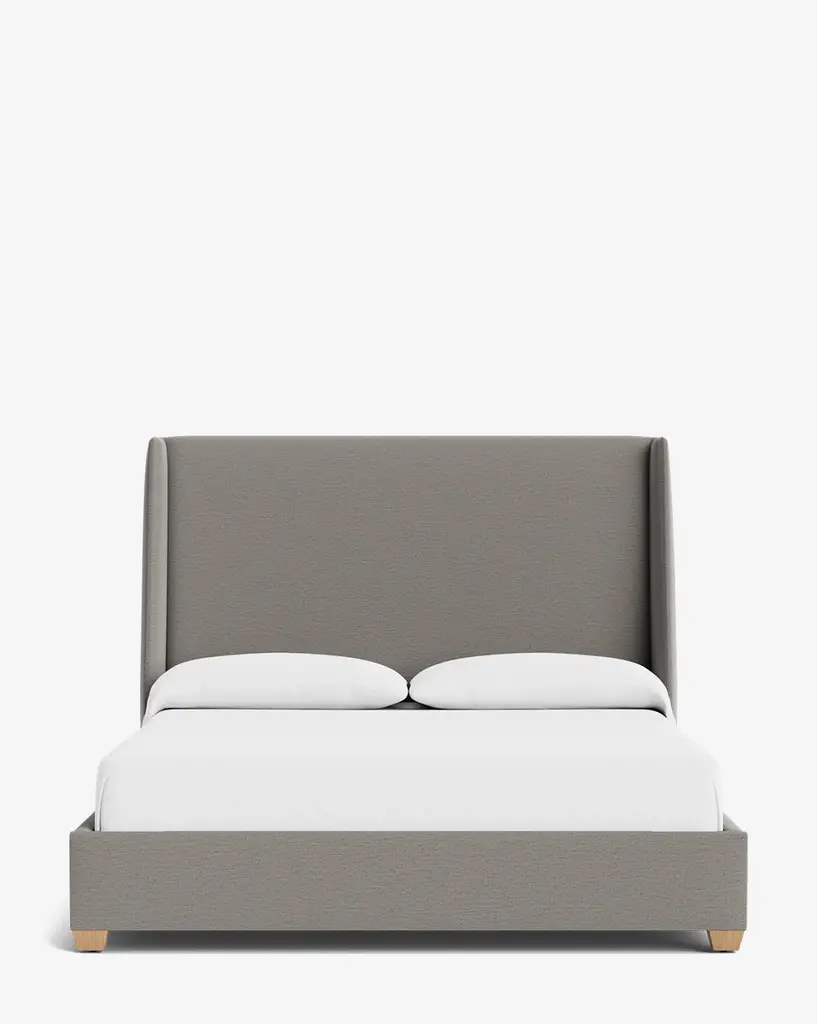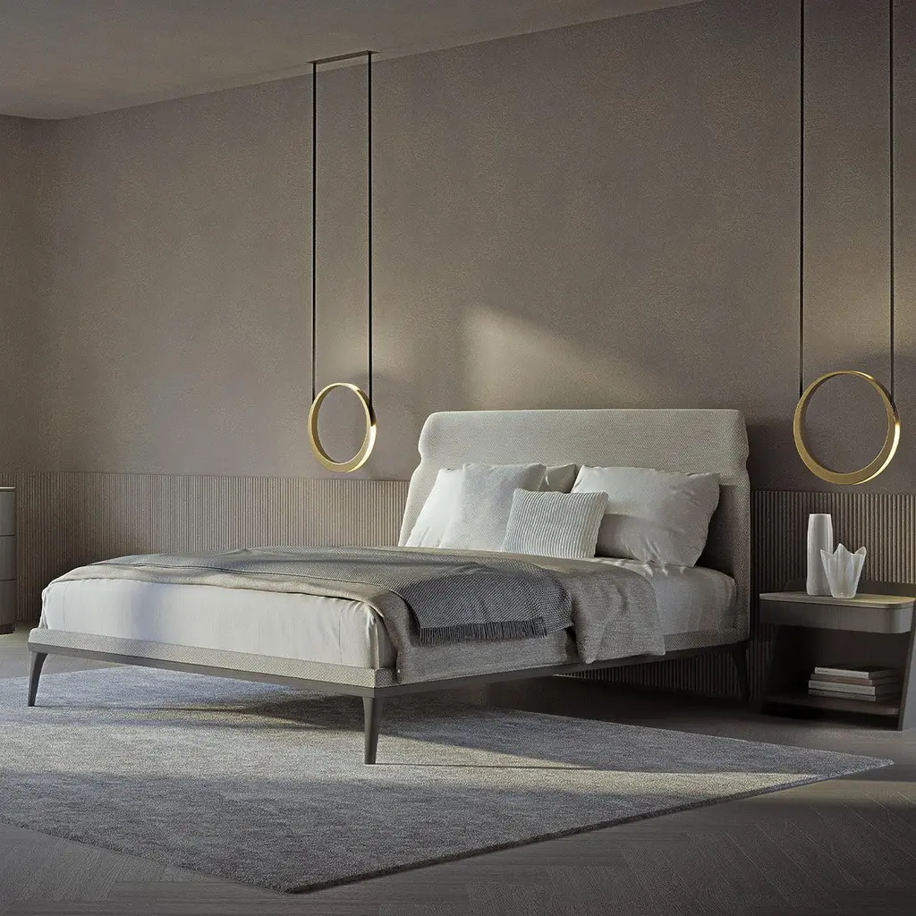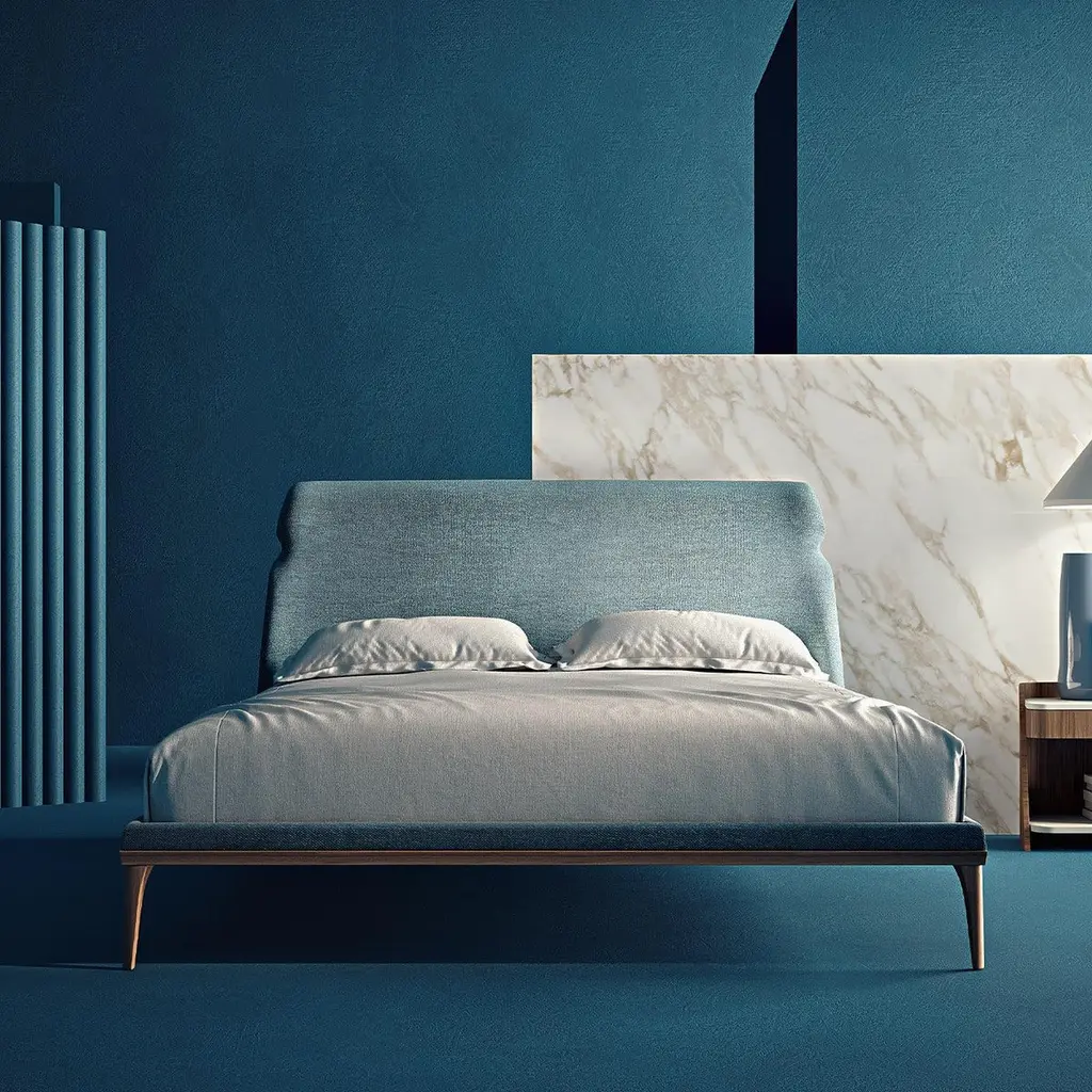 Bed with padded headboard, slightly curved, and embellished with the shape stylistic detail. Solid wood feet in Canaletto walnut shade, also available in dark Tay shade. Also available in King Size. Upholstery available in fabric, leather, and Nabuk. Only the bed structure is included.
