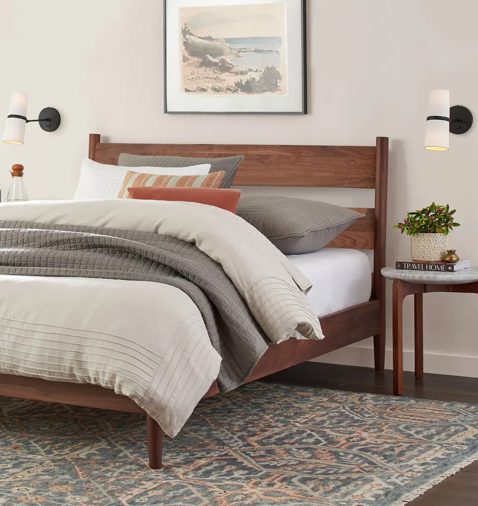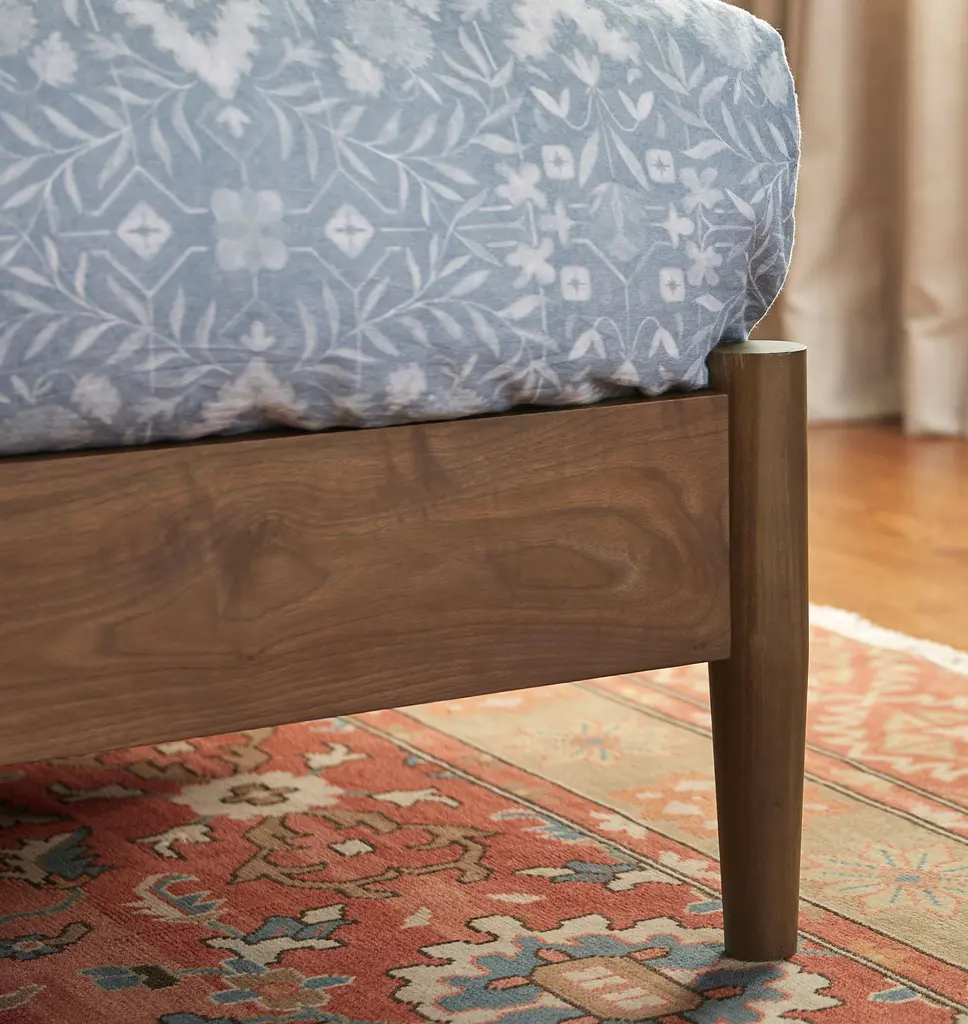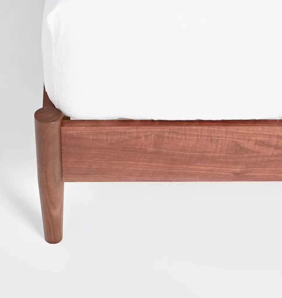 Tapered legs, a handsome slatted headboard, solid and veneer walnut construction combine for a truly timeless bed frame. The Shaw Bed mixes Mid-Century-inspired details with classic Danish design for a minimal, modern silhouette.