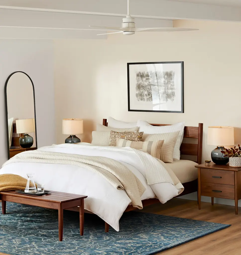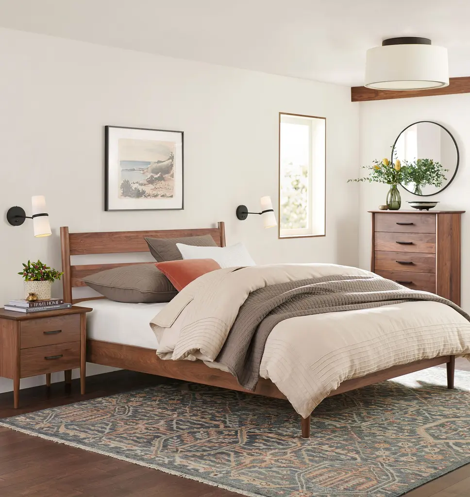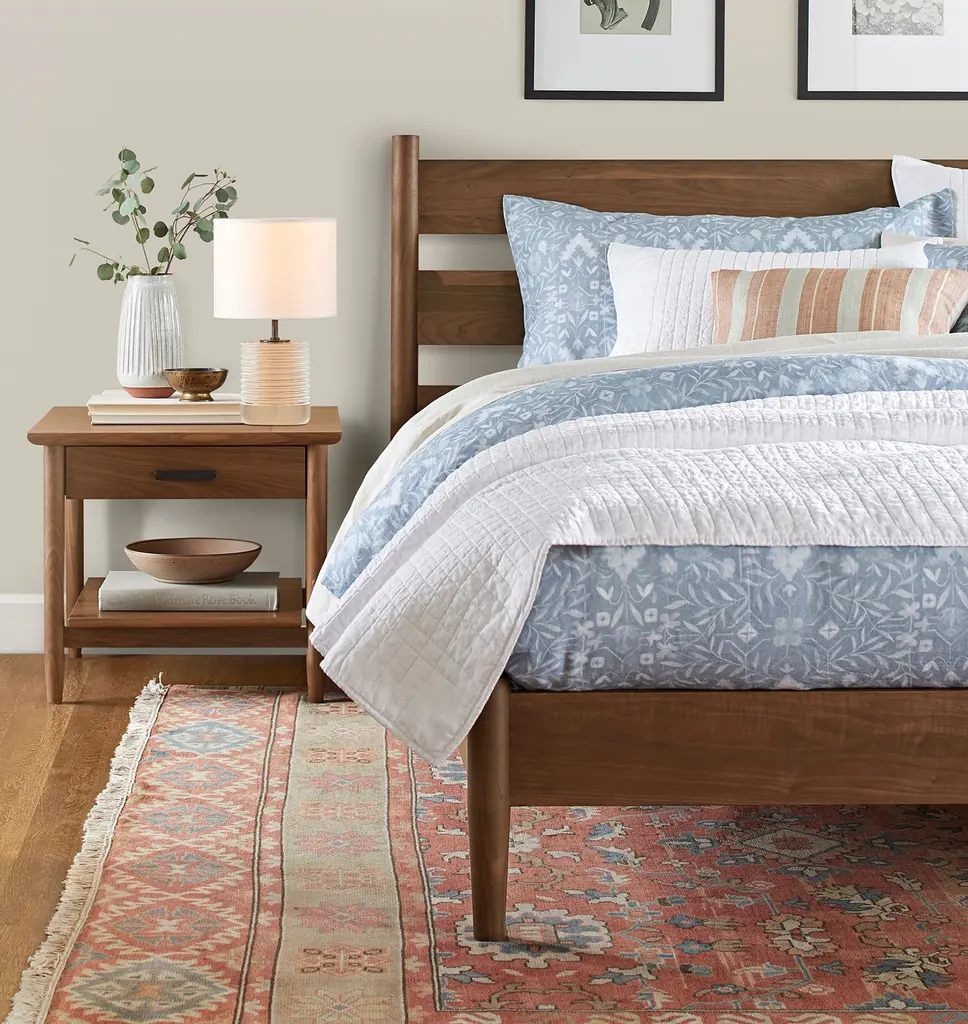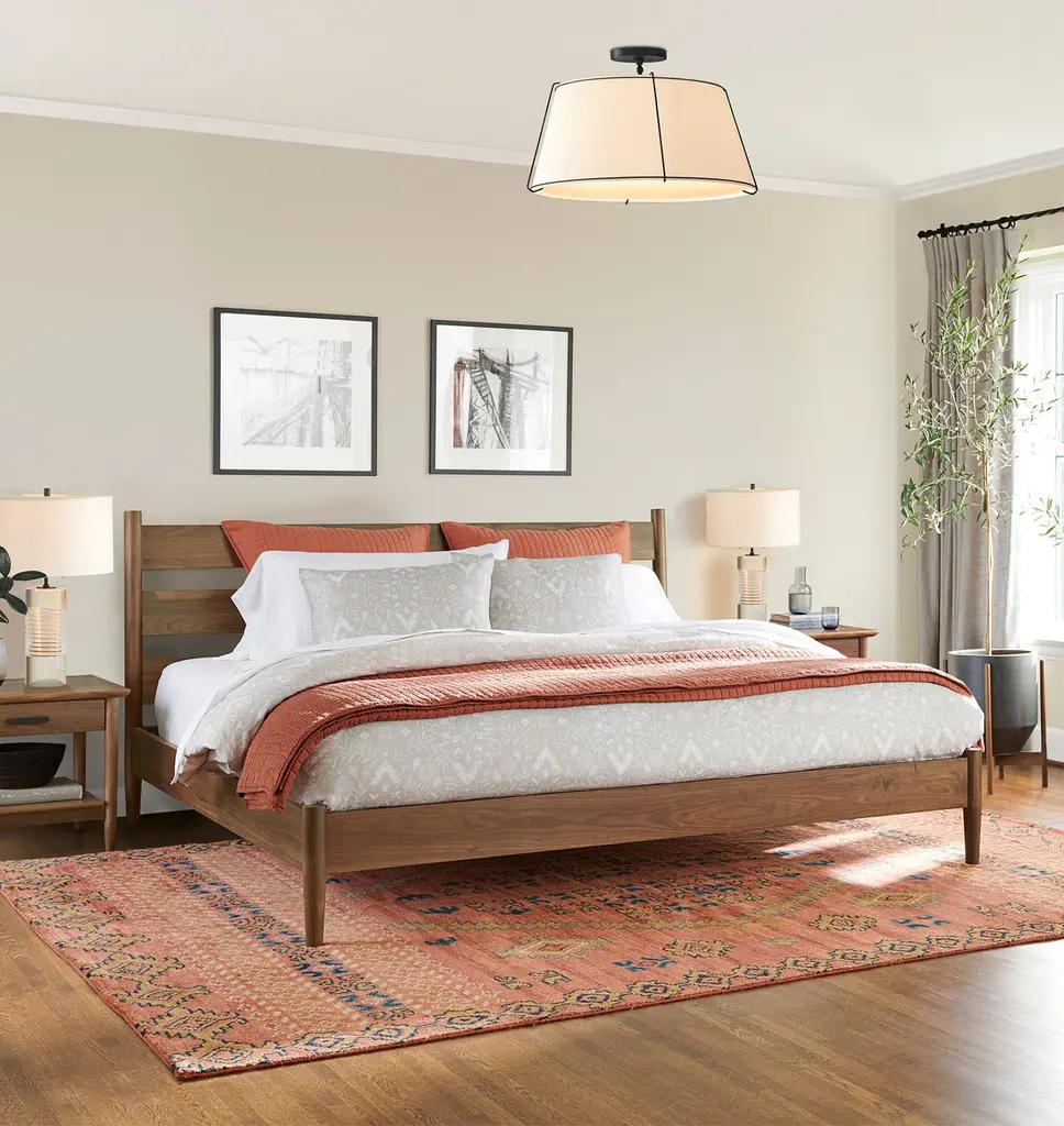 Tapered legs, a handsome slatted headboard, solid and veneer walnut construction combine for a truly timeless bed frame. The Shaw Bed mixes Mid-Century-inspired details with classic Danish design for a minimal, modern silhouette.