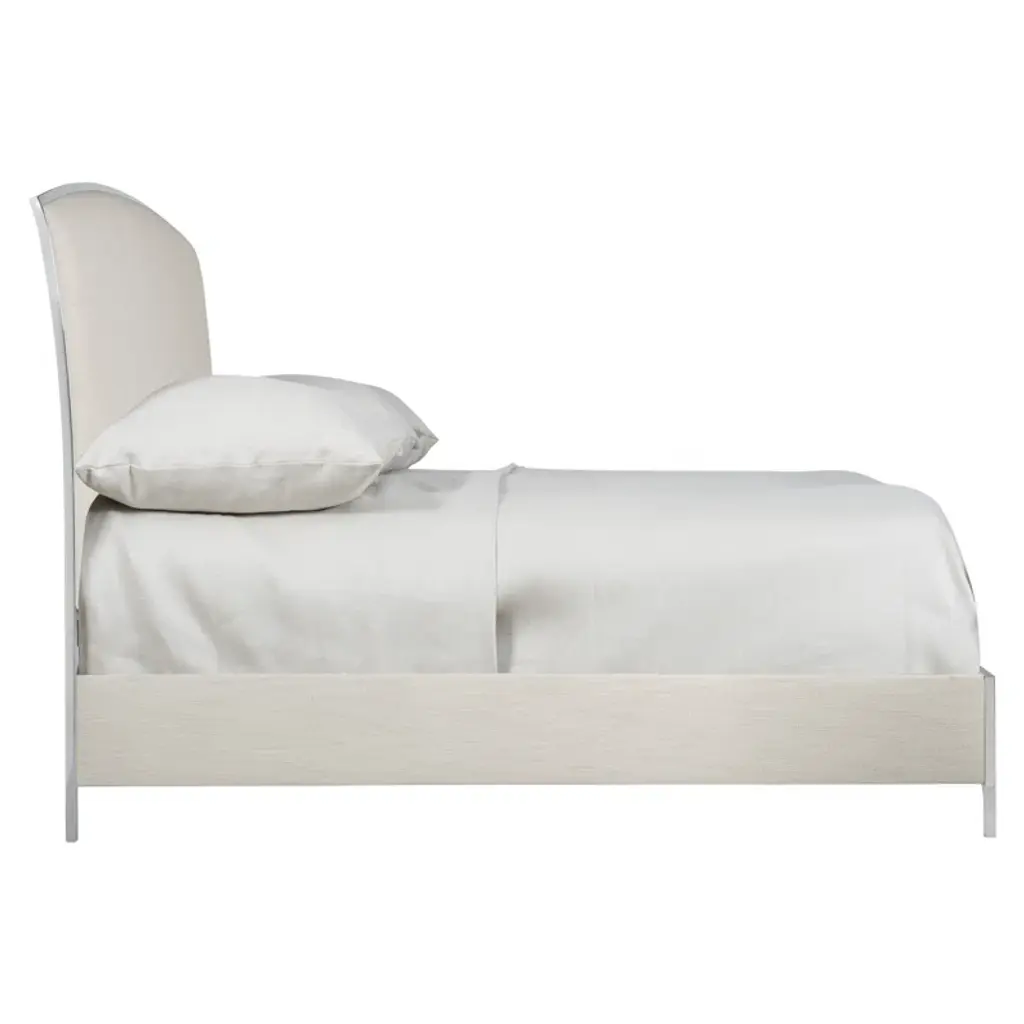 This opulent and comfortable upholstered panel bed is constructed from soft, textured fabric and brilliant stainless steel.