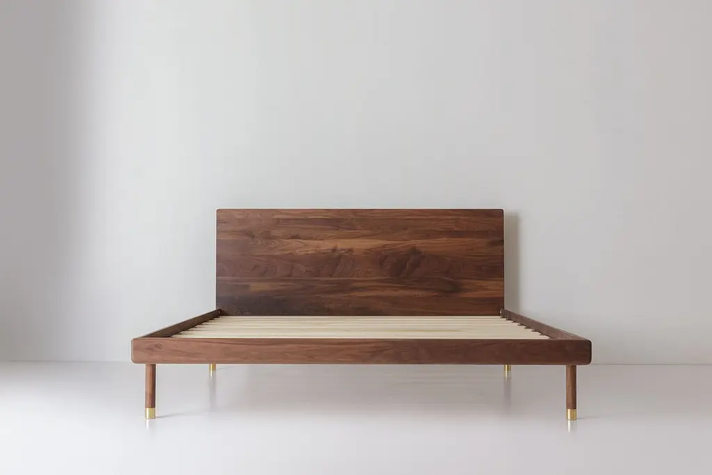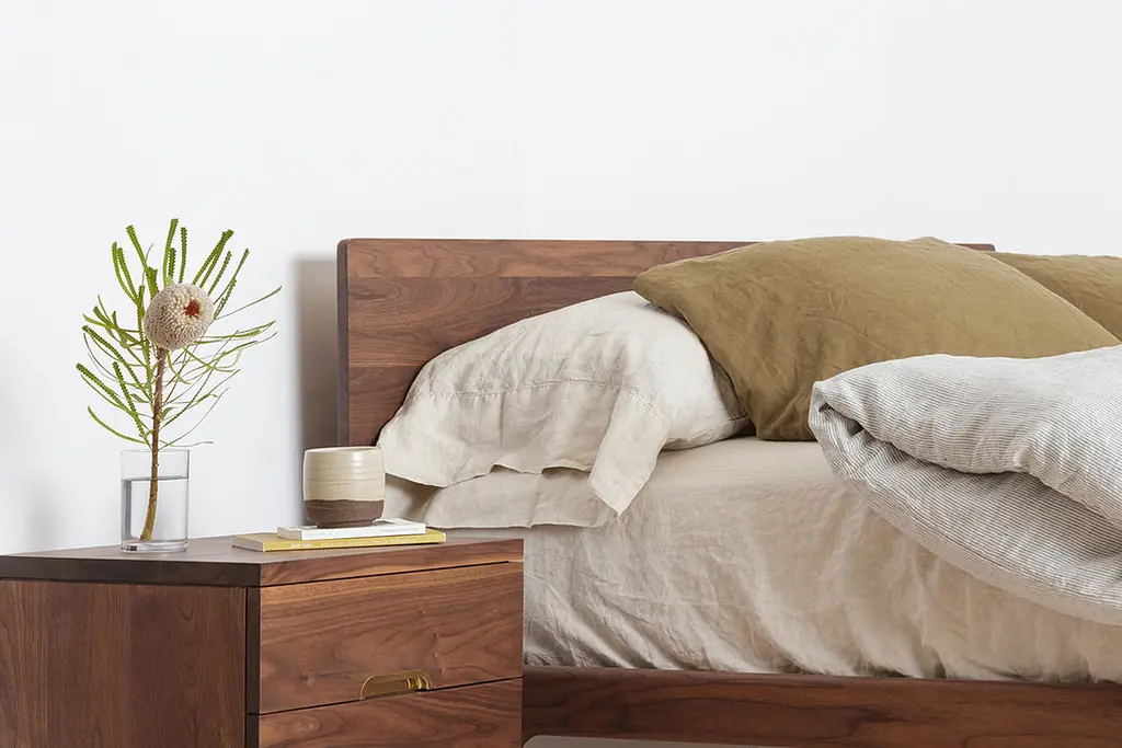Our Simple Bed is a favorite for its streamlined versatility and softly-detailed warmth. Carefully considered in every way — from the custom live finishes developed to preserve the delicate beauty of raw wood down to the inset legs that keep shins and toes safe. Nodding to classic modernist aesthetics, Simple Bed is made with solid oil-rubbed domestic hardwood; smooth, machined brass imparts a candlelit luminosity. The Simple Bed is made from solid, oil rubbed American Ash or American Black Walnut, with optional headboard and brass hardware details. Wood is hand-rubbed and finished with Kalon Standard Finish, a natural oil/wax finish painstakingly developed to enhance and maintain the wood’s beauty and breathability.