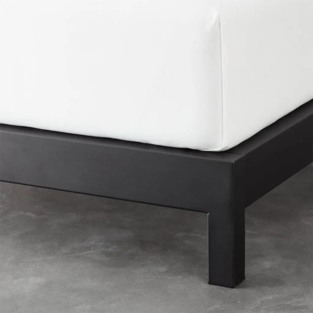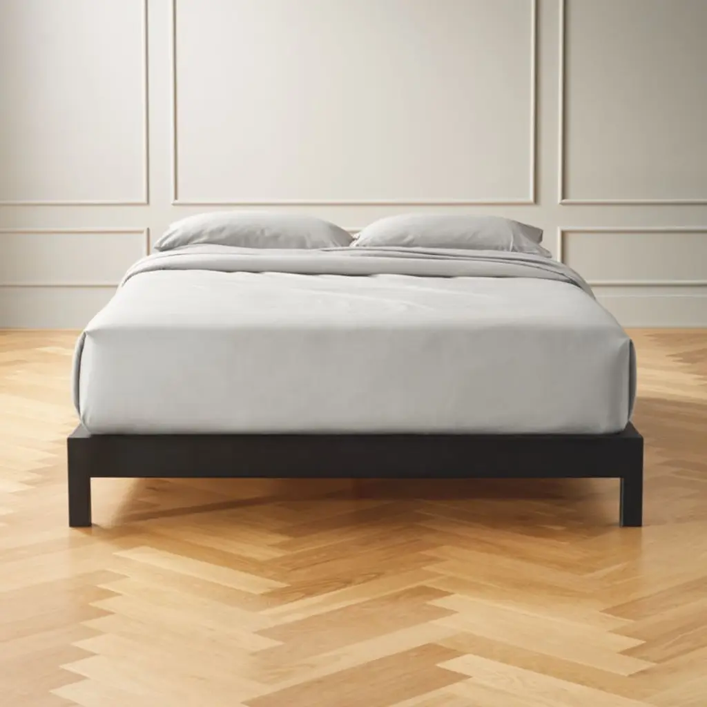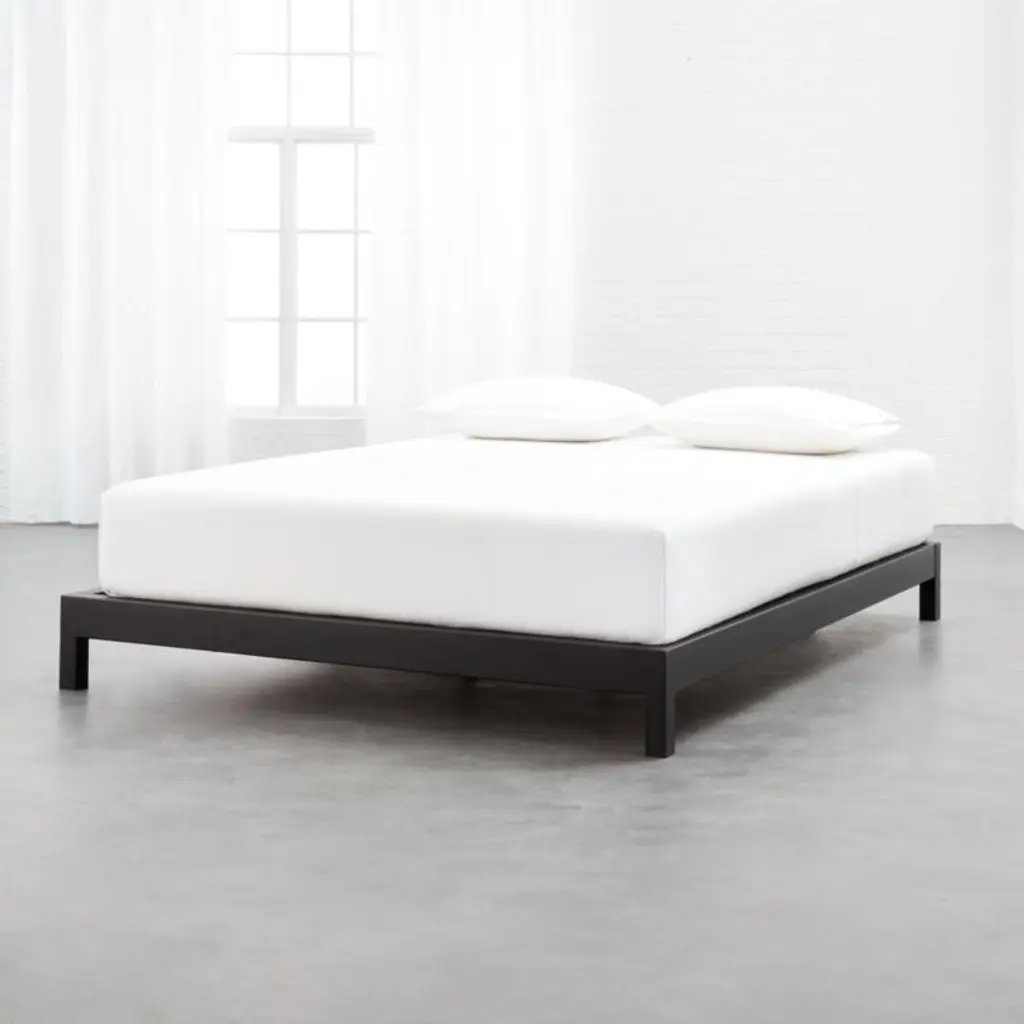 Versatile iron bed base gets your mattress off the ground with a minimal design. Pine wood slats bring a sturdy foundation. Pair with a headboard or use alone as a platform bed. CB2 exclusive.
