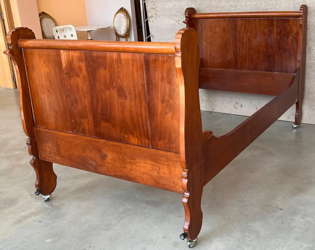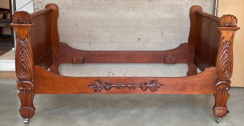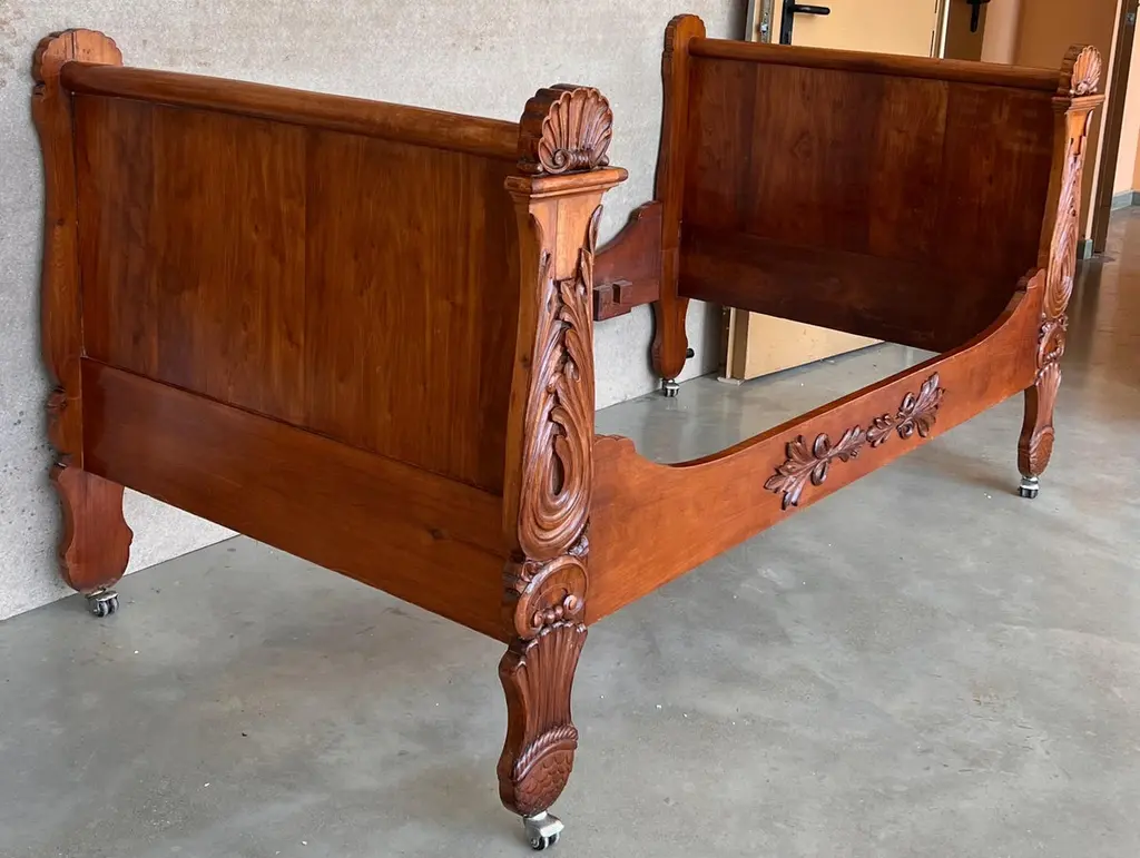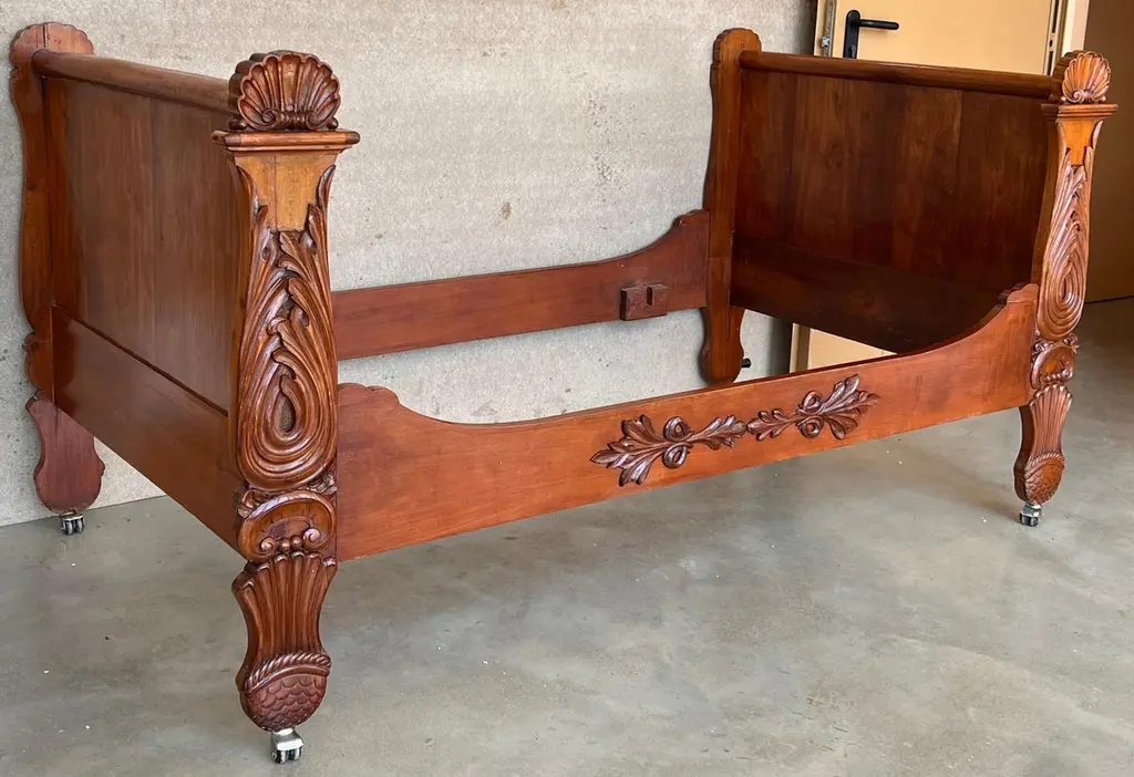 Beautiful boat bed in carved mahogany Louis Philippe period. Its small dimensions allow it to be used also as a bench. The four legs are equipped with casters, which allows him to move easily. Mattress: Full Doble 42 " x 75".