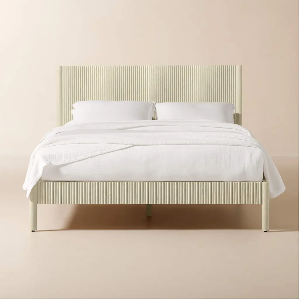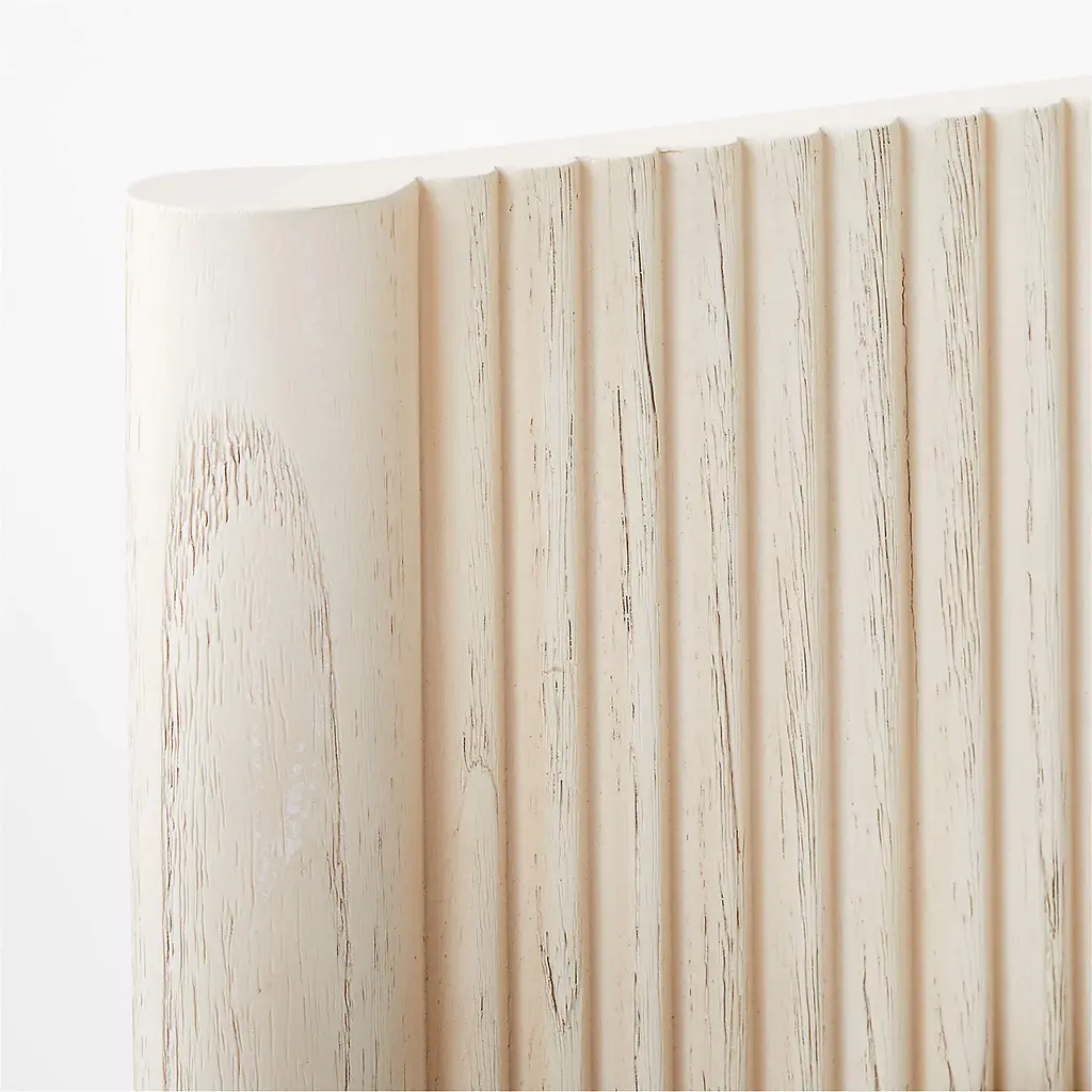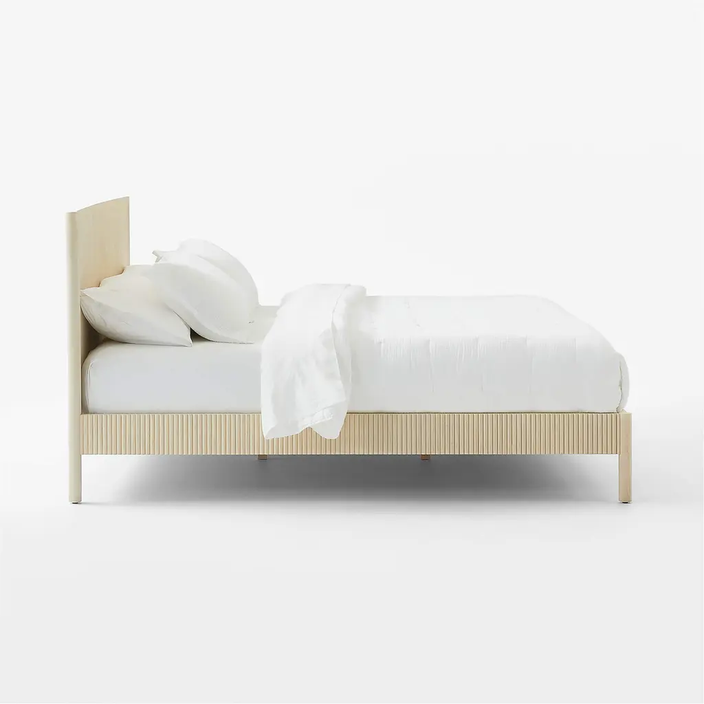 Minimalist reads refined in the channeled wood platform bed by Barcelona-based Mermelada Estudio. Crafted of whitewashed mindi wood, the head- and footboard are accented with vertical carved channels that extend down the side rails. The whitewash finish lends richness while allowing the organic character of the wood to come through, making each naturally one of a kind. CB2 exclusive.