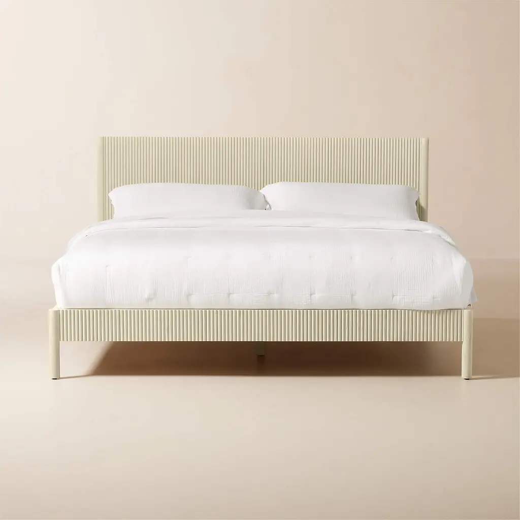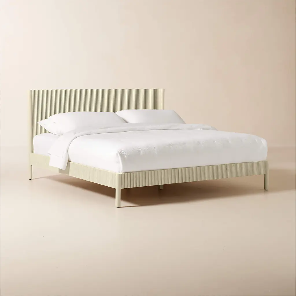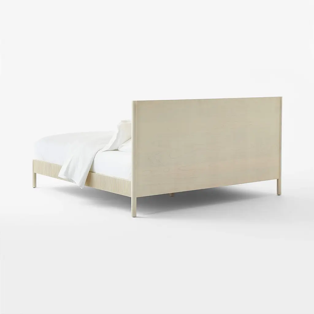 Minimalist reads refined in the channeled wood platform bed by Barcelona-based Mermelada Estudio. Crafted of whitewashed mindi wood, the head- and footboard are accented with vertical carved channels that extend down the side rails. The whitewash finish lends richness while allowing the organic character of the wood to come through, making each naturally one of a kind. CB2 exclusive.