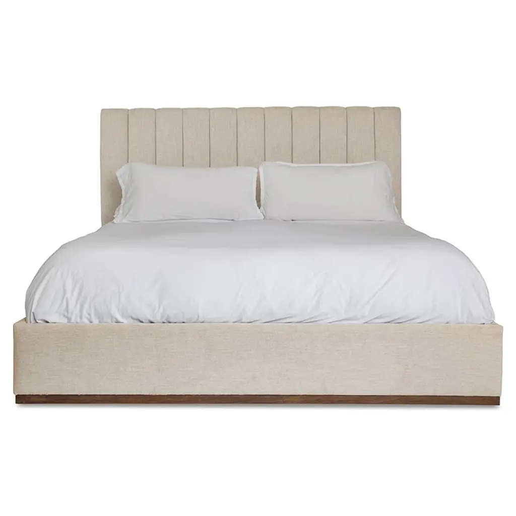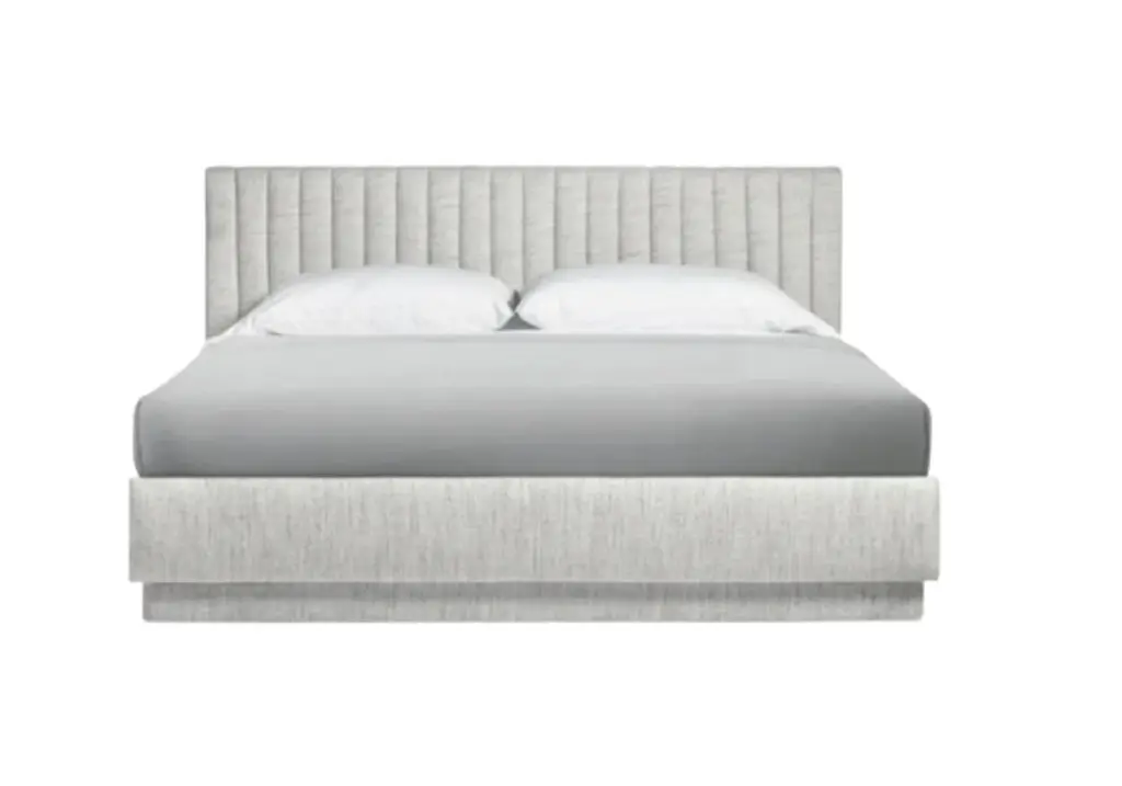 Art Deco-inspired and stunningly glamorous, the Skylar King Bed in aria sand features streamlined vertical channels on the headboard.