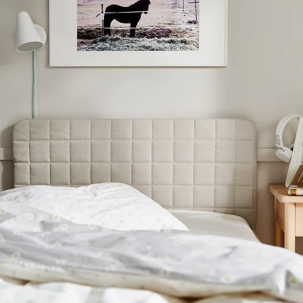 SLÄKT Headboard with cover - Vissle beige. The padded headboard gives SLÄKT bed a warm, soft and cozy feel. An easy way to update your child's room. The quilted surface feels comfy to lean against. It only takes a few steps to assemble and mount the headboard to SLÄKT bed.