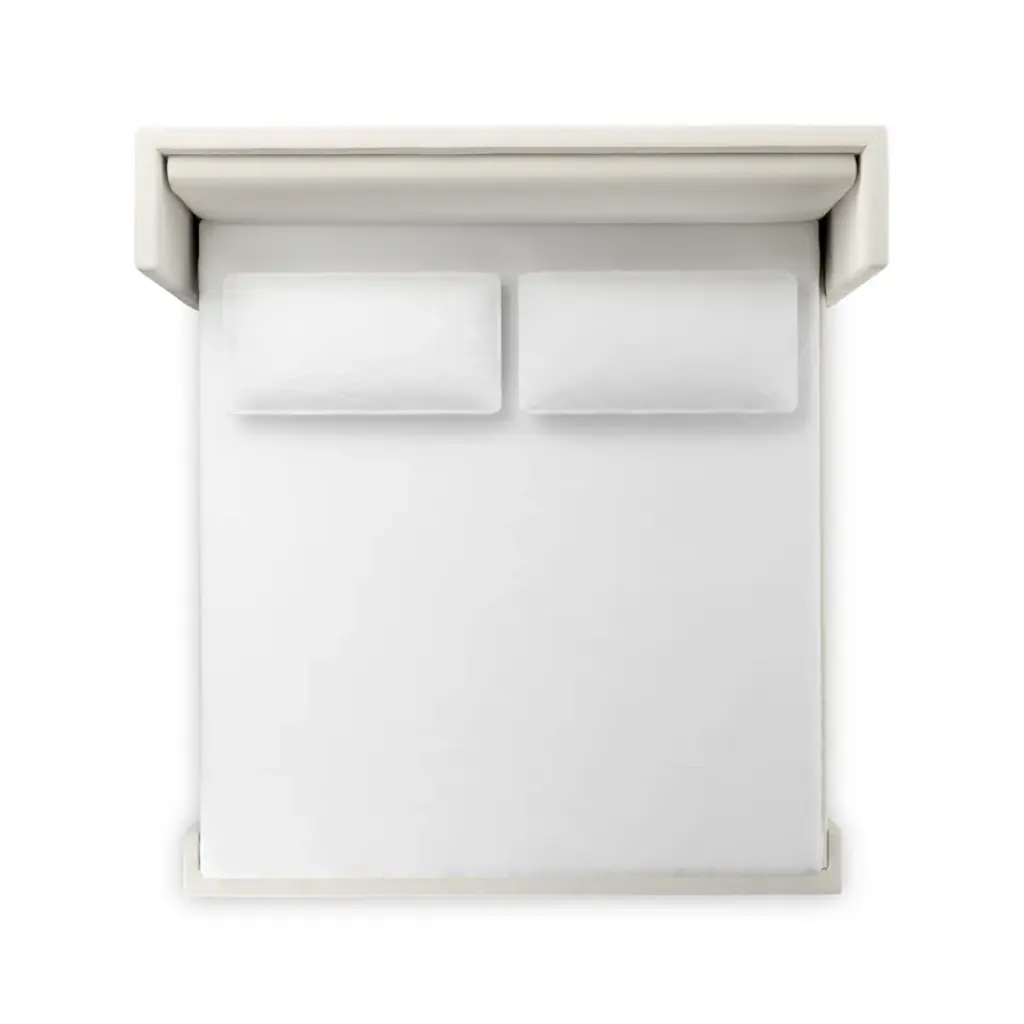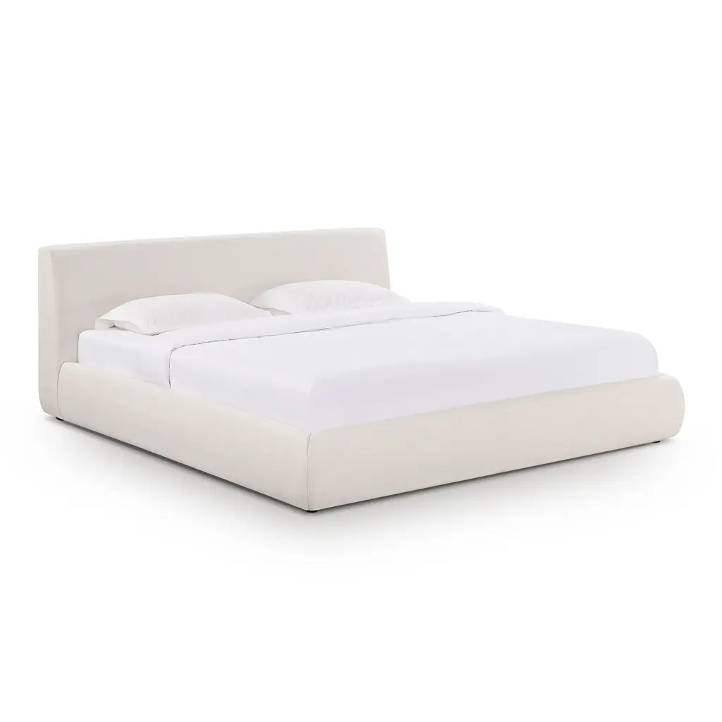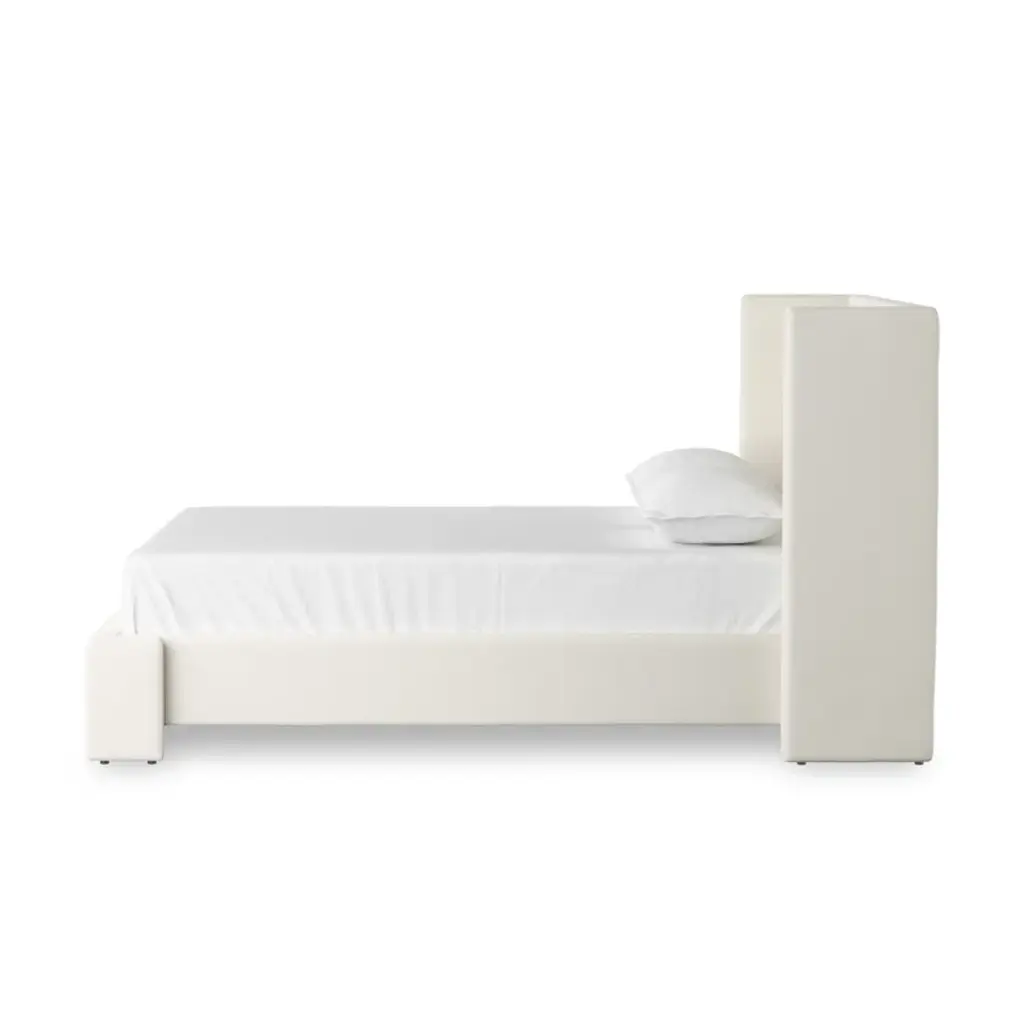 A shorter wingspan and geometric cutouts define this modern-day shelter wingback bed, designed for comfort from every angle. Upholstered in a cream fabric with a subtle texture and a soft hand.