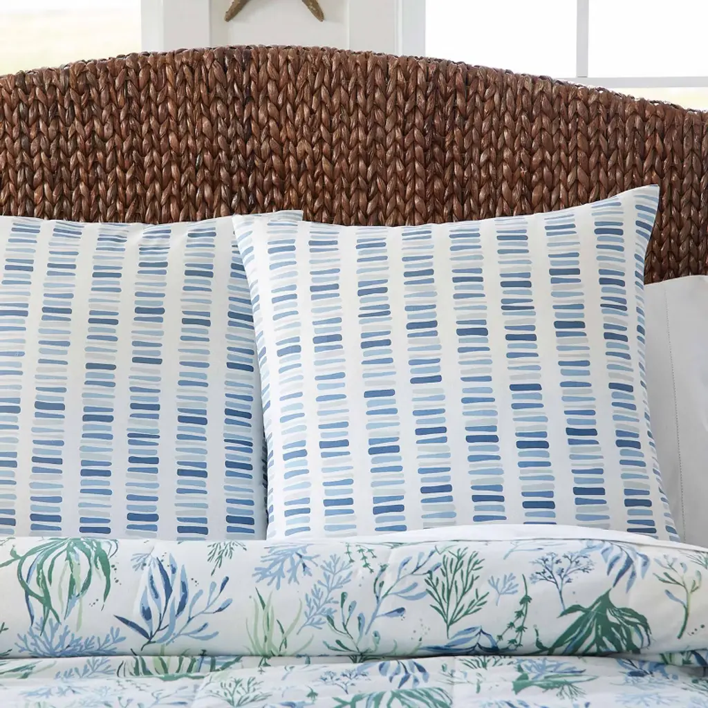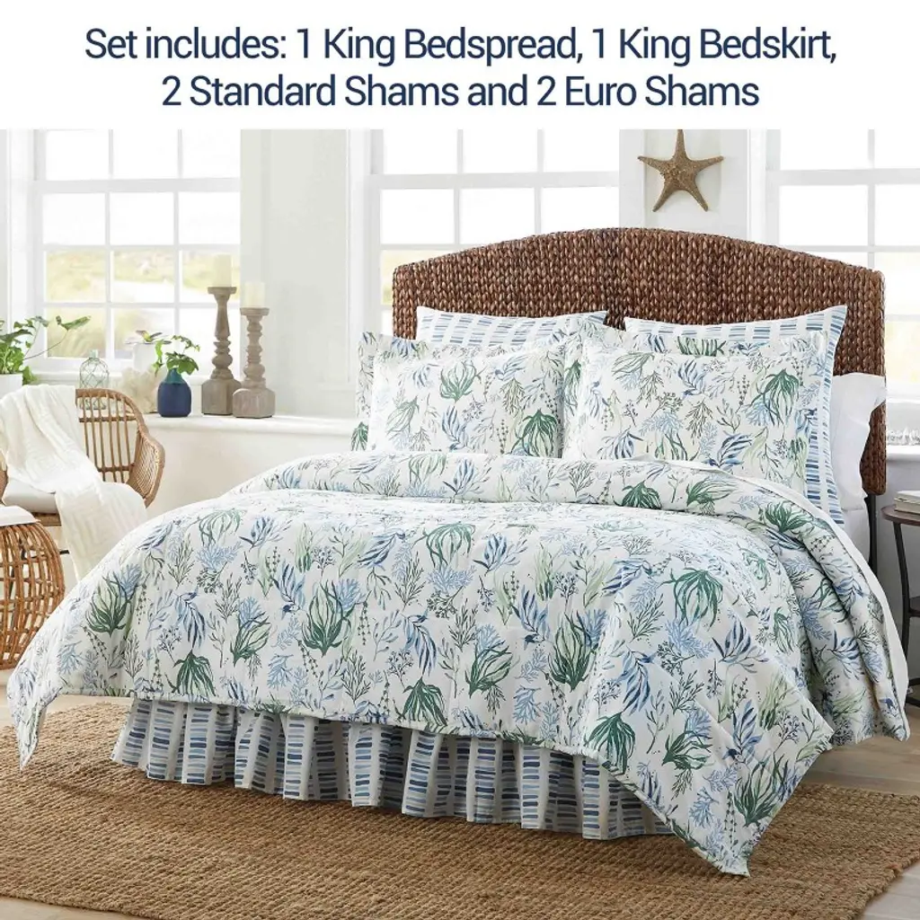 Bring the lively nature of the underwater sea into your coastal bedroom decor with this aquatic bed bundle. Includes a king bedspread, complementary striped bed skirt, two king pillow shams, and two euro pillow shams. Introduces a splash of color brought by the oceanic life design of seaweed and other aquatic plants in various gorgeous green and beautiful blue hues. Create a cozy feel and cohesive visual appeal by combining each of the elements in this bed bundle; versatile to use in a main bedroom, teen bedroom, or guest room. Each item in this set is both comfortable and lightweight, allowing for the perfect king bedding set to utilize all year-round.
