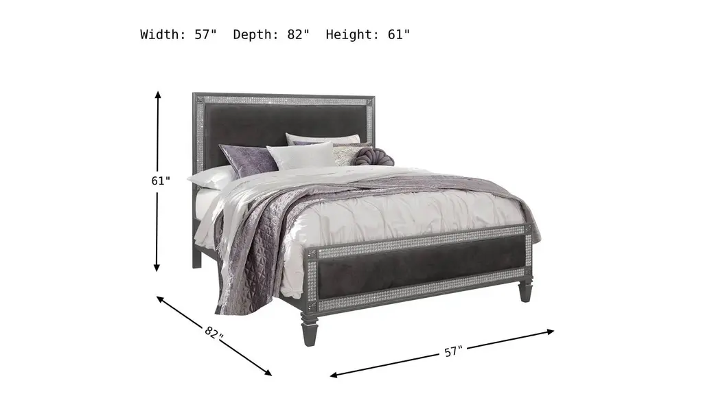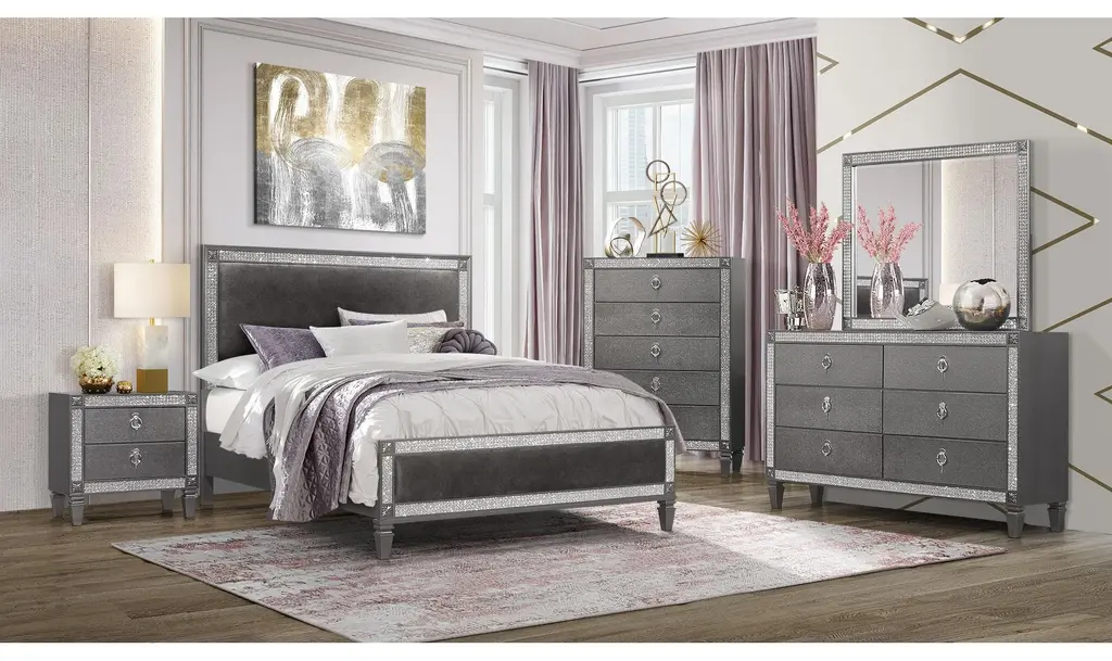 This glamours bedroom features unique style and design. The bed has a beautifully padded upholstered headboard with customer crystal like inlays that outline the design along with wood corner appliques. The bed has an elegant stance with the four feet lifting it nicely off the floor. All the case pieces share the same design elements as the bed. The only difference is the beautiful custom chrome hardware that completes the look. This bedroom would make any room feel like a castle.