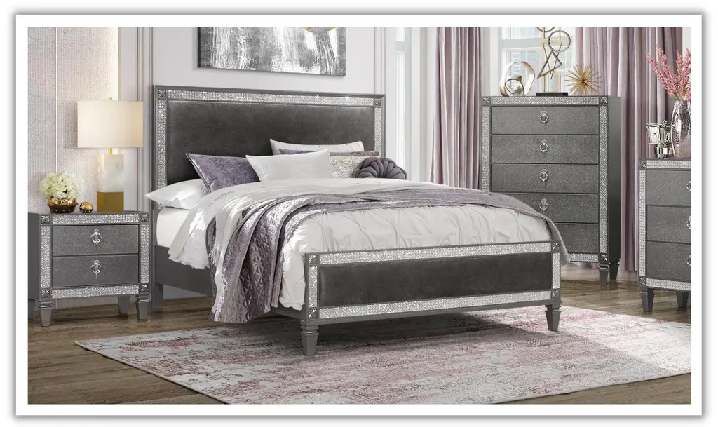 This glamours bedroom features unique style and design. The bed has a beautifully padded upholstered headboard with customer crystal like inlays that outline the design along with wood corner appliques. The bed has an elegant stance with the four feet lifting it nicely off the floor. All the case pieces share the same design elements as the bed. The only difference is the beautiful custom chrome hardware that completes the look. This bedroom would make any room feel like a castle.