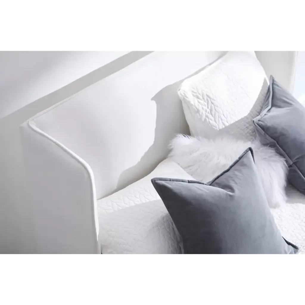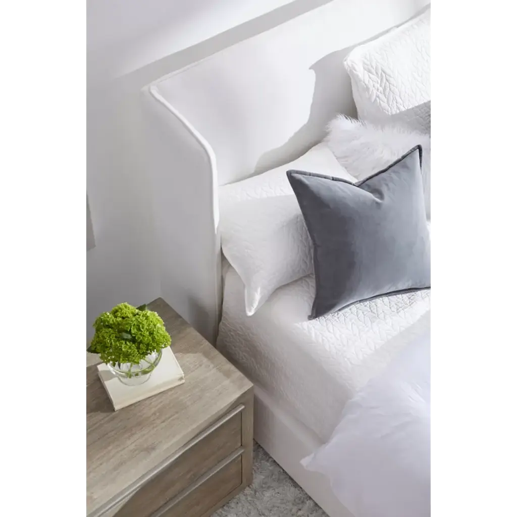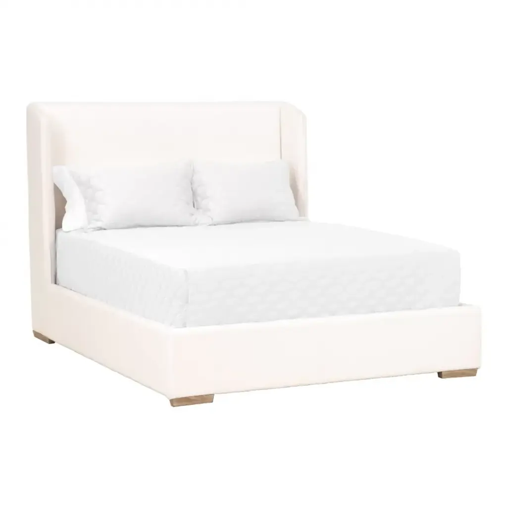 This wingback upholstered California king bed frame will add sophistication and class to any bedroom. The Livesmart Peyton Pearl fabric and solid oak feet create a neutral palette that will work well with many color combinations. The frame features a removable metal frame European slat system and stain resistant fabric. Designed for dependability and durability, this transitional style Cal king bed frame will be a great addition to your bedroom.