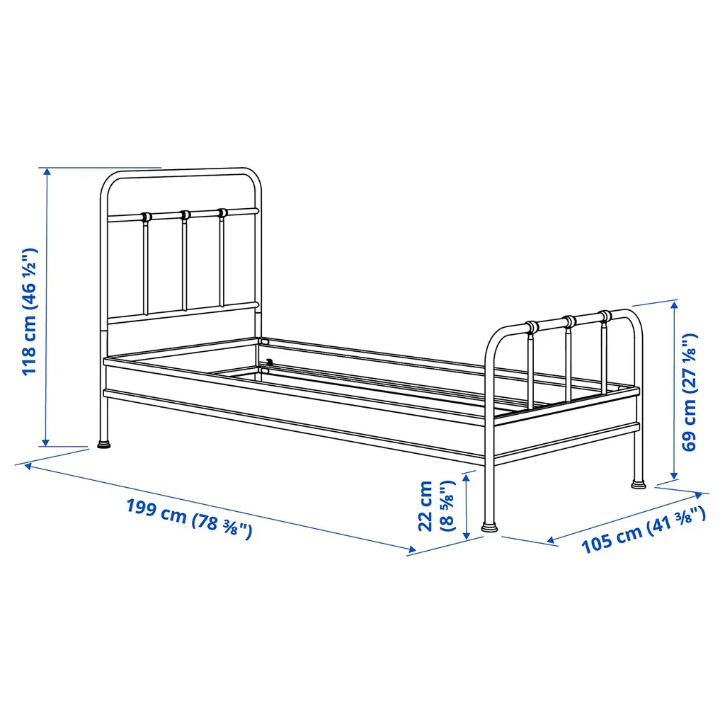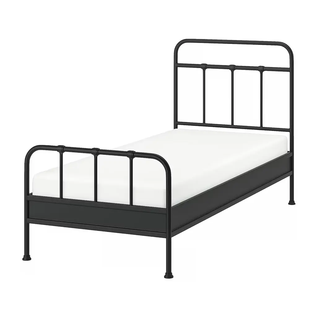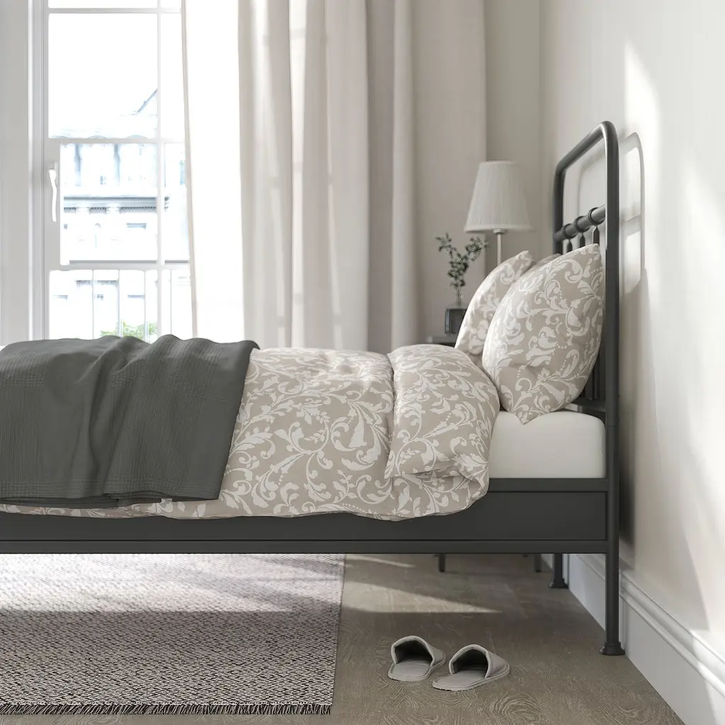 STJÄRNÖ Bed frame - anthracite/Luröy Twin. Whether you prefer a classically romantic style or a modern and bold one, your existing bed textiles and bedroom furniture will go perfectly with this bed frame. The high footboard keeps bed textiles from falling onto the floor while you sleep.