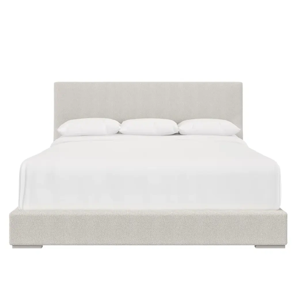 The Stratum panel bed is fully upholstered with a modernist frame and a slightly angled headboard. The sleek lines provide deep comfort set upon exposed wood feet in the mist finish.
