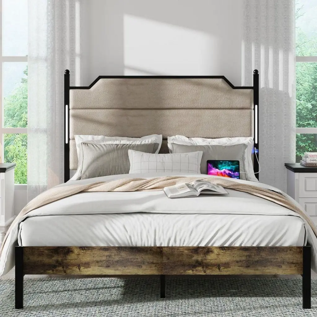 Streamdale Queen Bed Frame With Upholstered Headboard, Charging Station & Led Lights