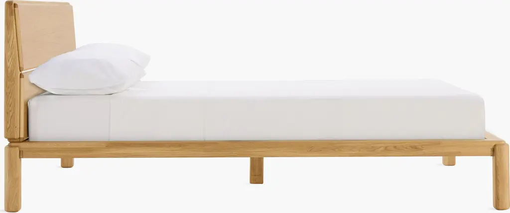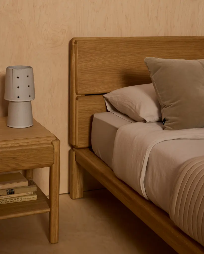 The DWR-exclusive Sumu Collection combines the best of two worlds: The Japanese wood joinery technique of tsugite and carpentry techniques from Eastern Europe. With its gently rounded edges, the Sumu Bed (2024) brings a serene, pared-back beauty to the bedroom. Masterful wood-working seamlessly connects the solid oak frame without glue or nails. Artfully exposed joints highlight the simple beauty of the wood. An optional headboard (sold separately) adds an extra layer of character, drawing attention to the intricate grain and fine craftsmanship. Made in Estonia.