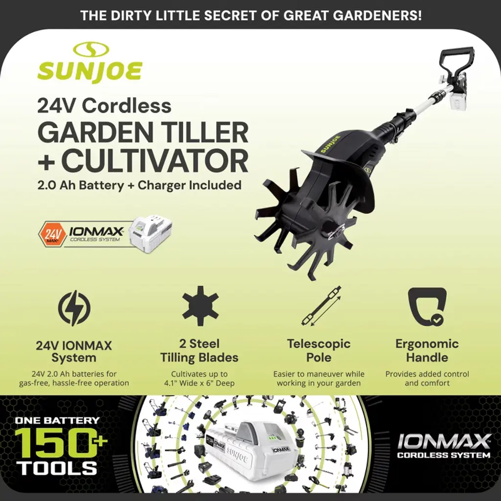 Sun Joe 24v Cordless Garden Tiller Cultivator Kit With Battery And Charger For Weeding, Soil Aeration And Prepping Plant Beds, Black, 24v-tlr-lte