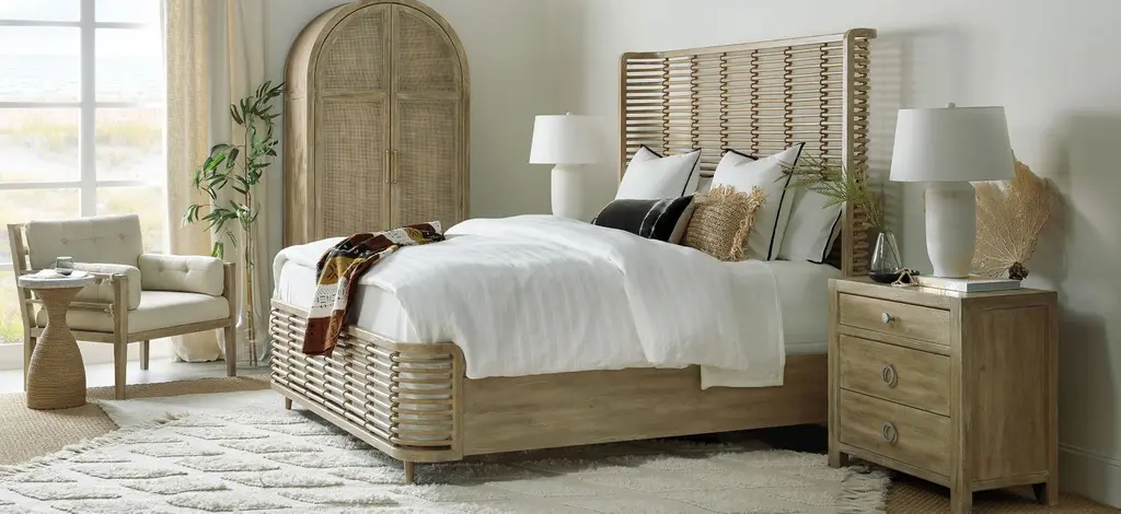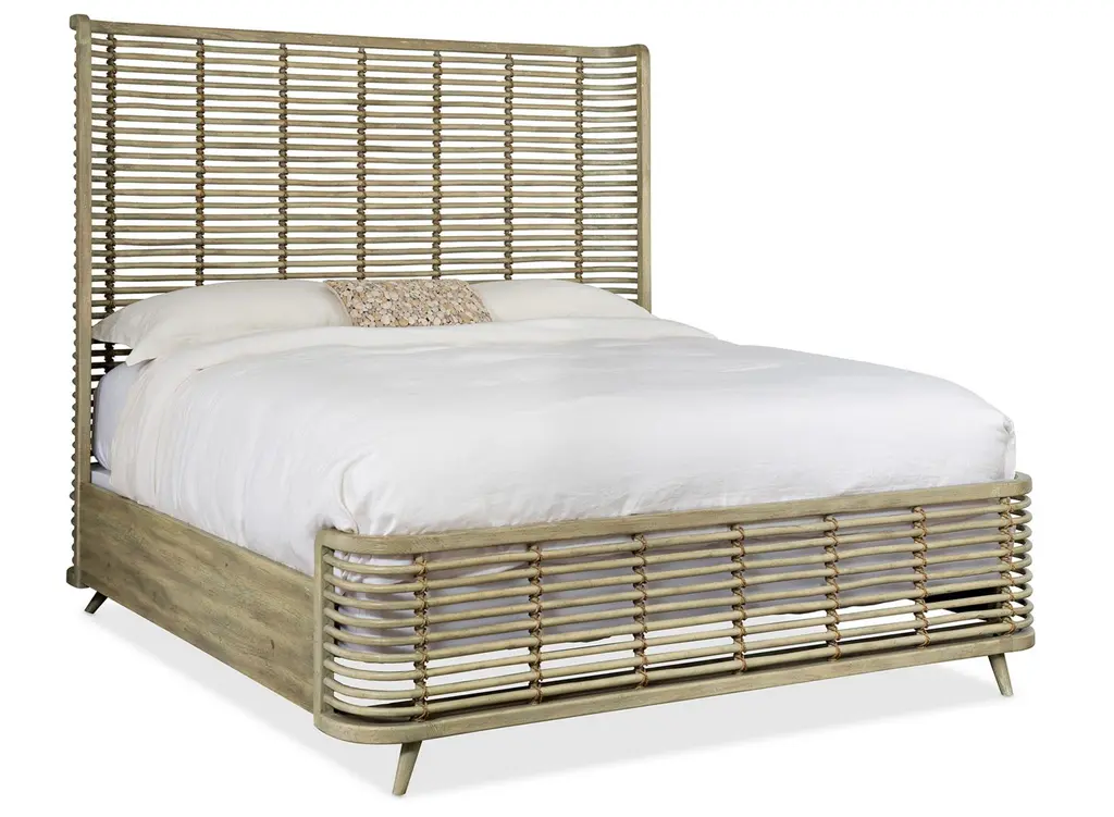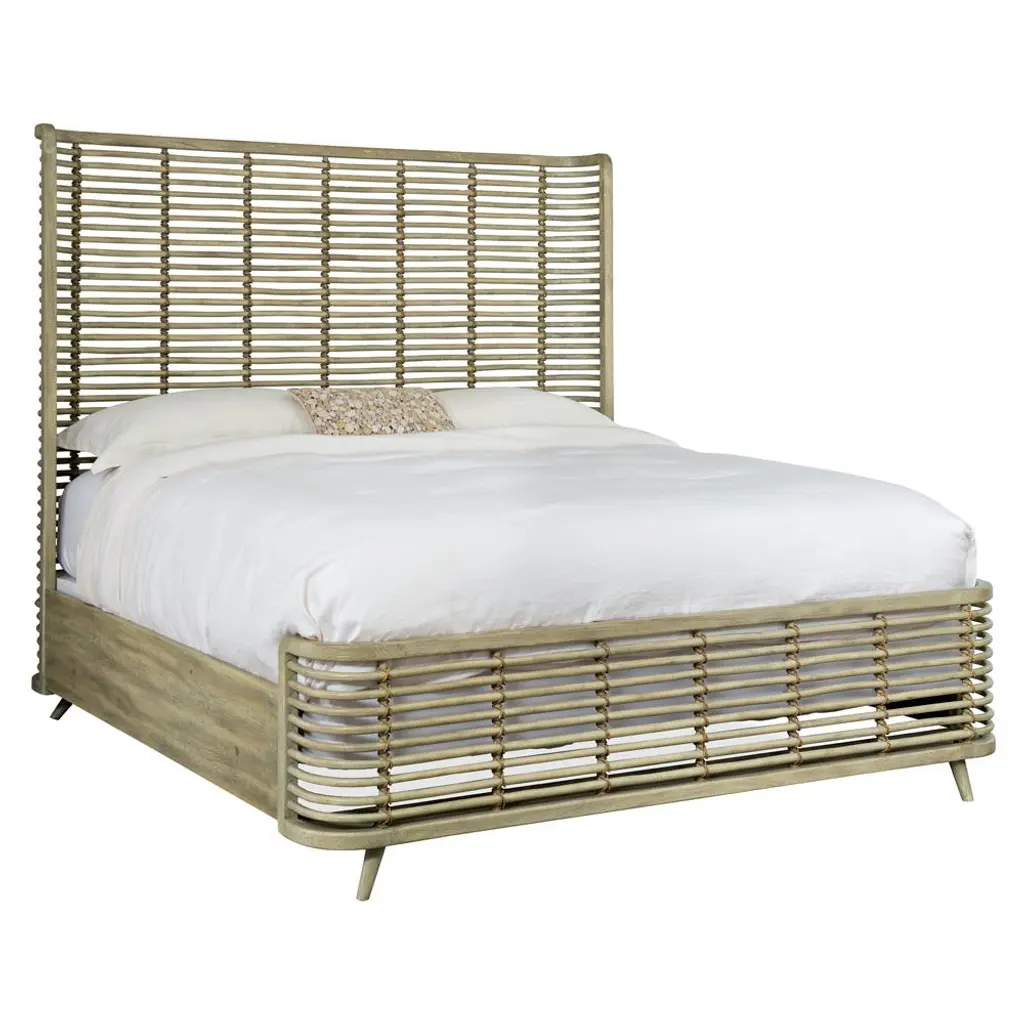 Crafted of Pecan Veneers, Cane, Raffia and hand-tied Jute Rope, the Sundance Queen Rattan Bed epitomizes a relaxed California casual lifestyle. The signature bed is finished a light natural finish called Driftwood with distressing including sandblasting and bleaching. Includes the headboard, footboard and rails.