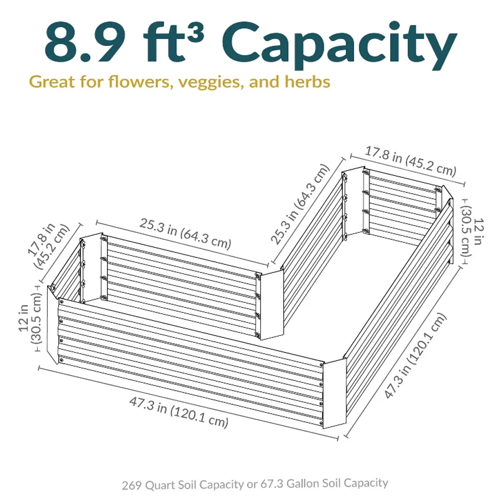 This elegant yet durable L-shaped steel garden bed is a wonderful addition to any outdoor space. This raised metal garden bed provides a number of benefits for a variety of plants. The bottomless design allows proper drainage for improved root health, and the bed can be filled with whatever type of soil is best for specific plants to create an optimal growing environment. This stylish garden bed features a unique L-shaped design that makes it great for placing in the corner of a patio or garden. This sturdy raised garden bed is made of durable galvanized steel for lasting strength and beauty season after season. This sophisticated raised garden bed is a beautiful centerpiece for the backyard, garden, or patio.• AMPLE SPACE FOR HEALTHY GROWTH: This galvanized metal garden bed provides plenty of room for growing a variety of deep-rooting plants in the backyard. The raised planter box measures 47.25" W x 47.25" D x 12" H, weighs 13.2 lbs, and has a soil capacity of 67.3 gal (8.9 cu ft).• DURABLE CONSTRUCTION: This outdoor raised garden bed is made from galvanized steel to resist rust and weathering over time.• IMPROVED GROWING CONDITIONS: This sturdy raised garden bed offers better growing conditions for vegetables and flowers. Raised garden beds allow anyone to choose the right soil for specific plants. Plus, the bottomless design ensures proper water drainage and encourages roots to grow deeper and stronger.• UNIQUE CORNER SHAPE: Add this galvanized raised planter bed to the patio or backyard. The unique L-shaped design makes it a great fit for corners and will add style to any outdoor space.• WORRY-FREE PURCHASING: Sunnydaze Decor backs its products with a 1-year manufacturer's warranty.