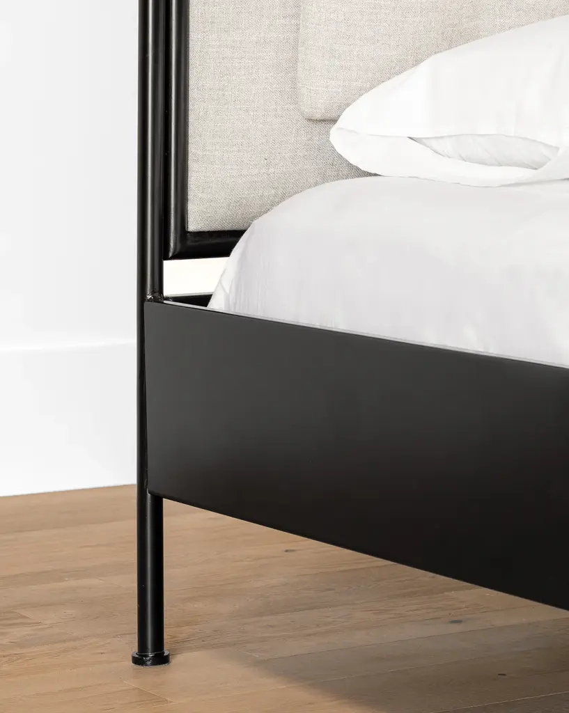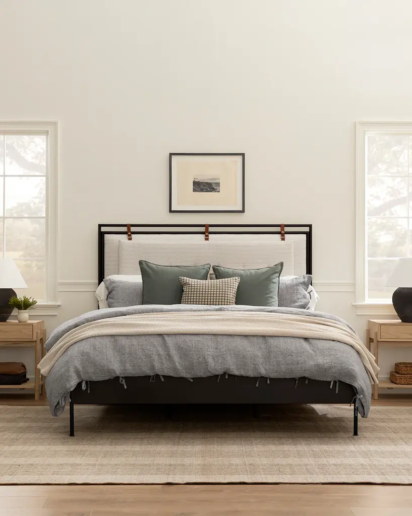 The Sutherland Bed brings an industrial yet cozy style to the bedroom. A padded, raised gray headboard gives dimension to the piece, with leather details that warm the palette. Held in a nuanced, black-metal frame that gives layers to this stunning bed, the Sutherland Bed brings design detail and warmth to elevate the style of any bedroom space.