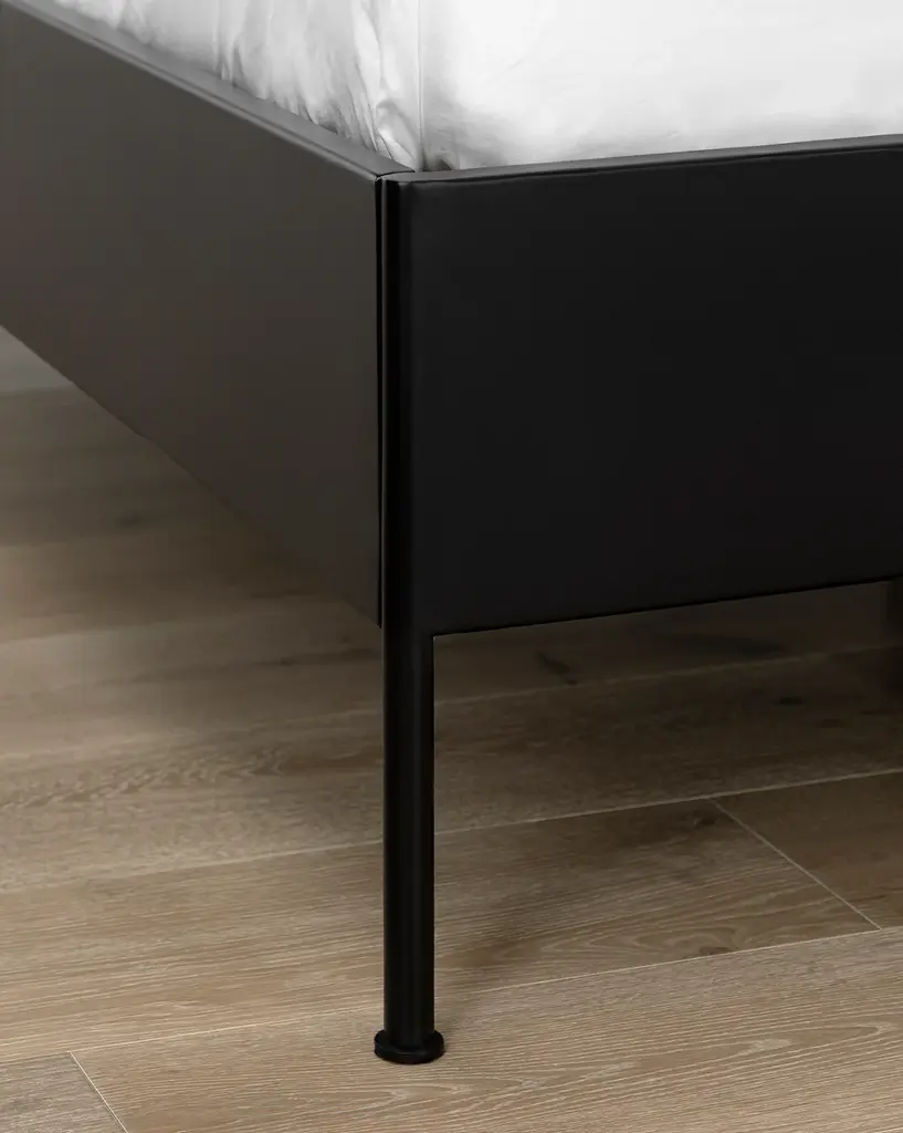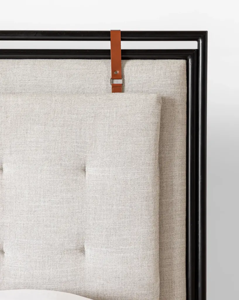 The Sutherland Bed brings an industrial yet cozy style to the bedroom. A padded, raised gray headboard gives dimension to the piece, with leather details that warm the palette. Held in a nuanced, black-metal frame that gives layers to this stunning bed, the Sutherland Bed brings design detail and warmth to elevate the style of any bedroom space.