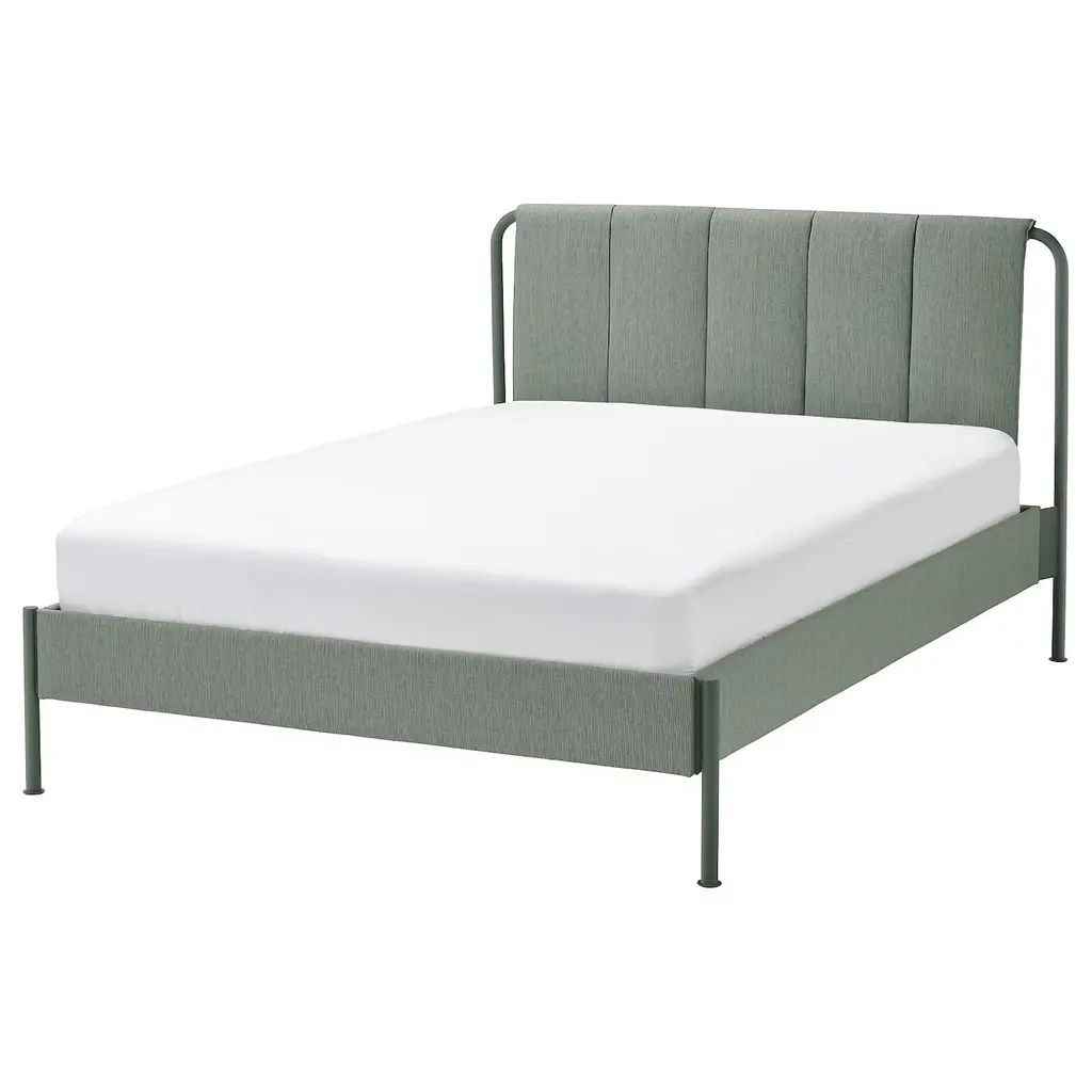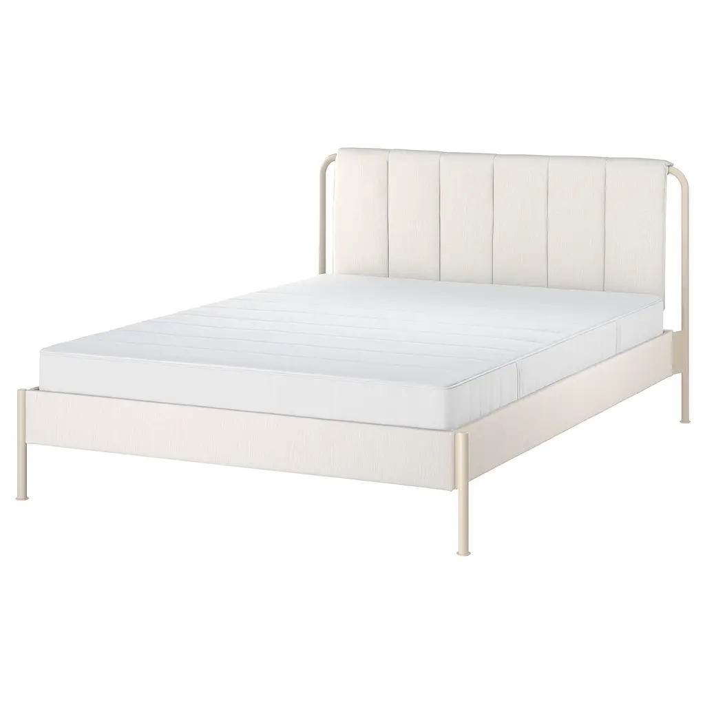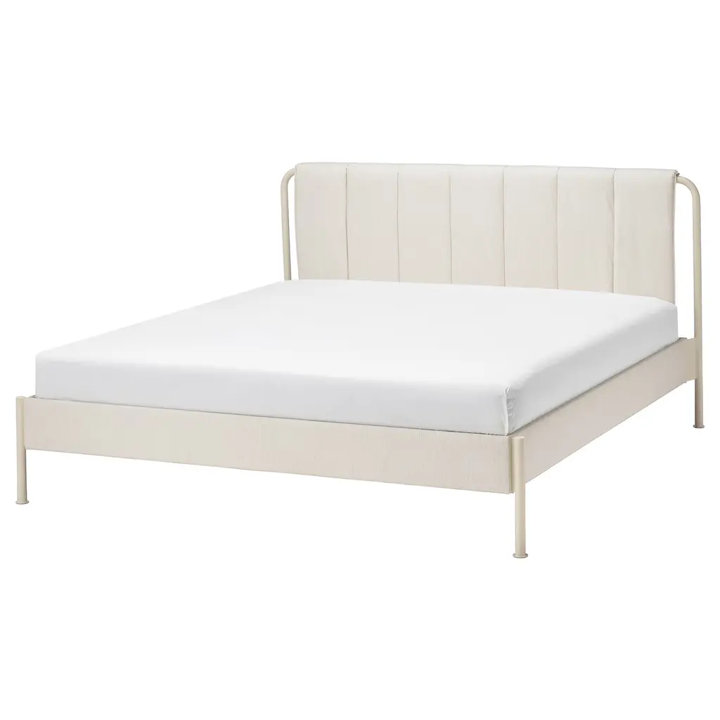 TÄLLÅSEN Upholstered bed frame - Kulsta light beige Full. The clean and sturdy design with several well-thought-out details gives TÄLLÅSEN upholstered bed frame a modern look – easy to combine with other bedroom furniture. Adjustable bed sides allow you to use mattresses of different thicknesses.
