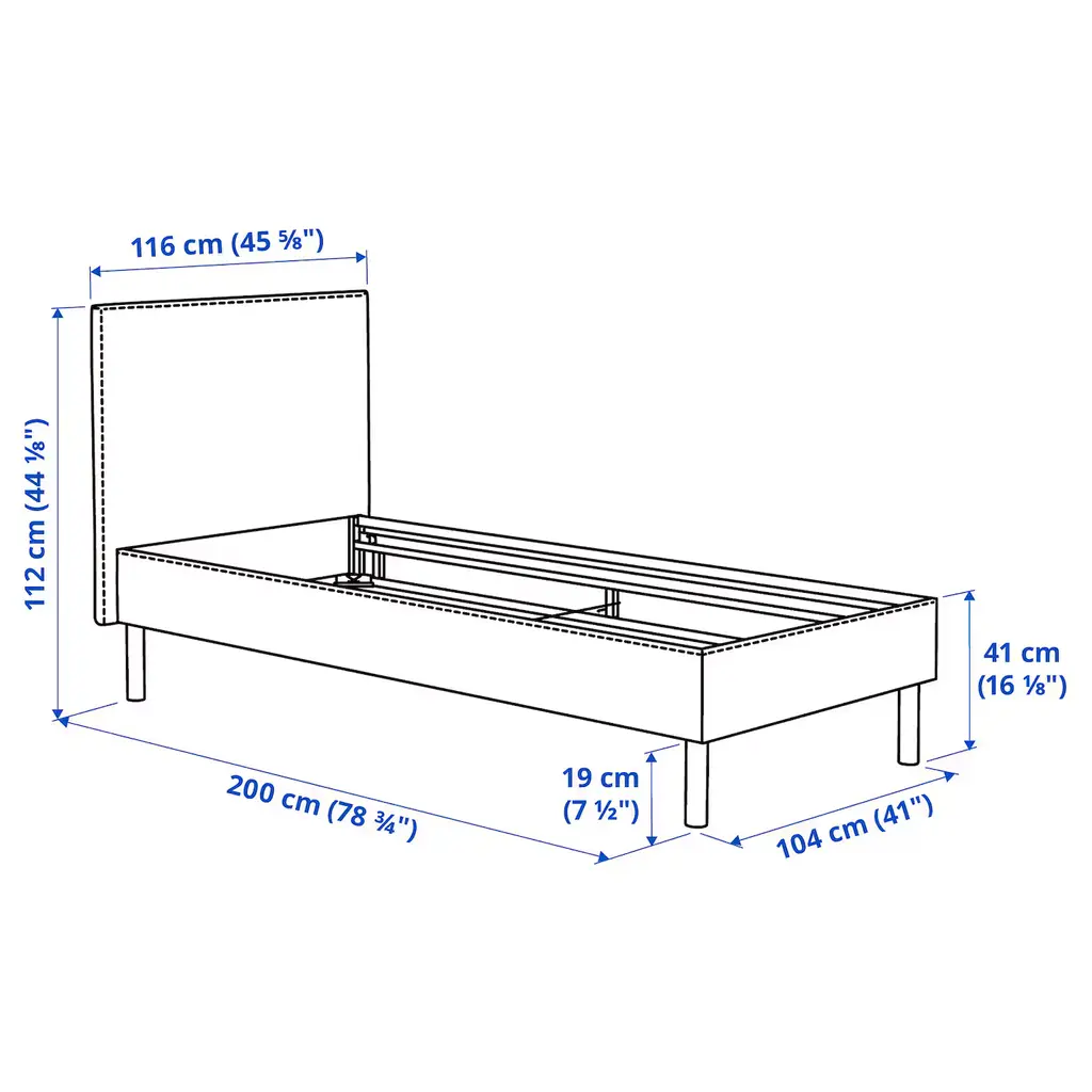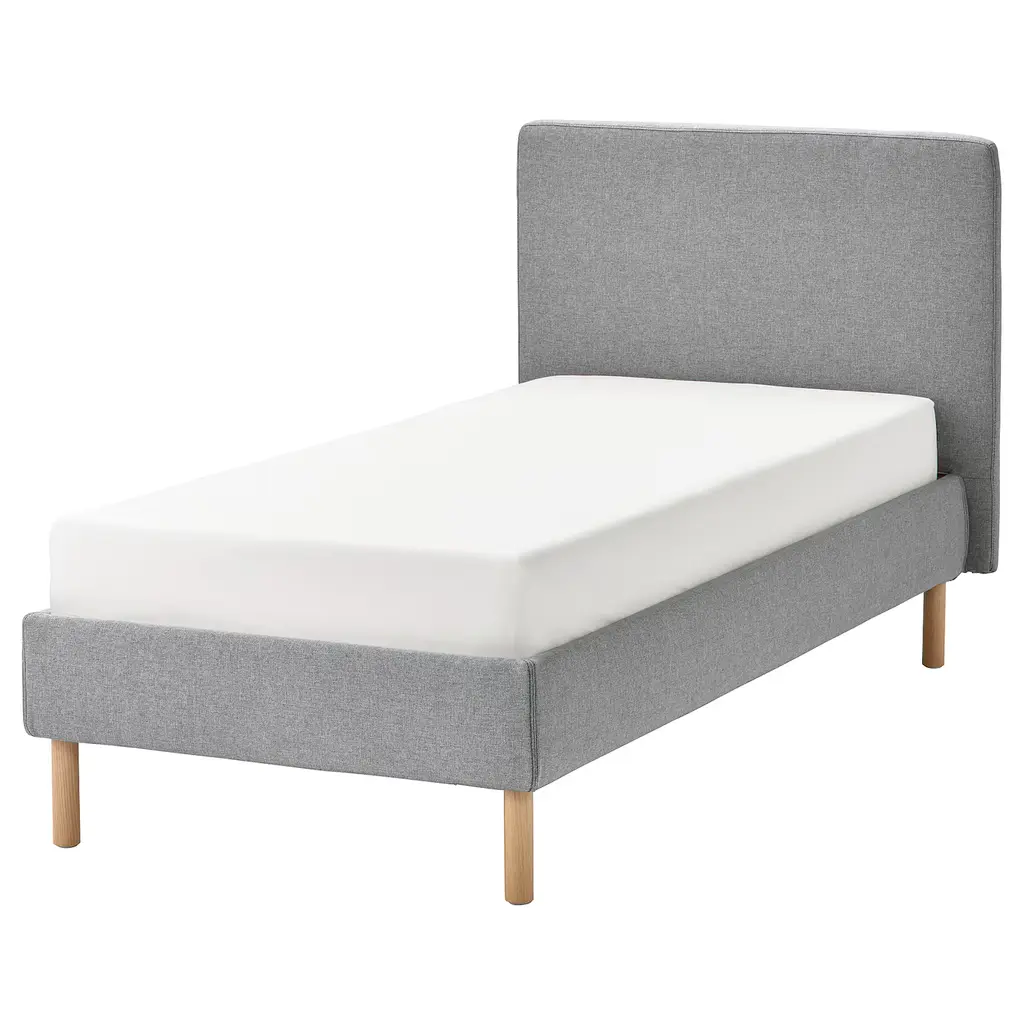 TÄRNKULLEN Upholstered bed frame - Tibbleby beige/gray/Luröy Twin. LURÖY slatted bed base with curved slats helps to absorb your body weight and supports your body, while the open construction allows air to circulate and keeps the mattress fresh. Mattress and bedlinens are sold separately.