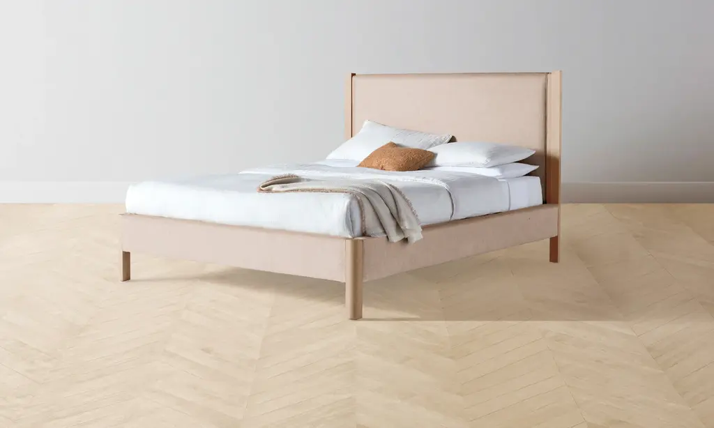 The Thompson Bed is an expression of graceful simplicity. It has an ash frame with rounded corners and neat upholstery along the headboard, foot rail, and sides, creating a perfect balance of rigidity and softness. Handcrafted in North Carolina.