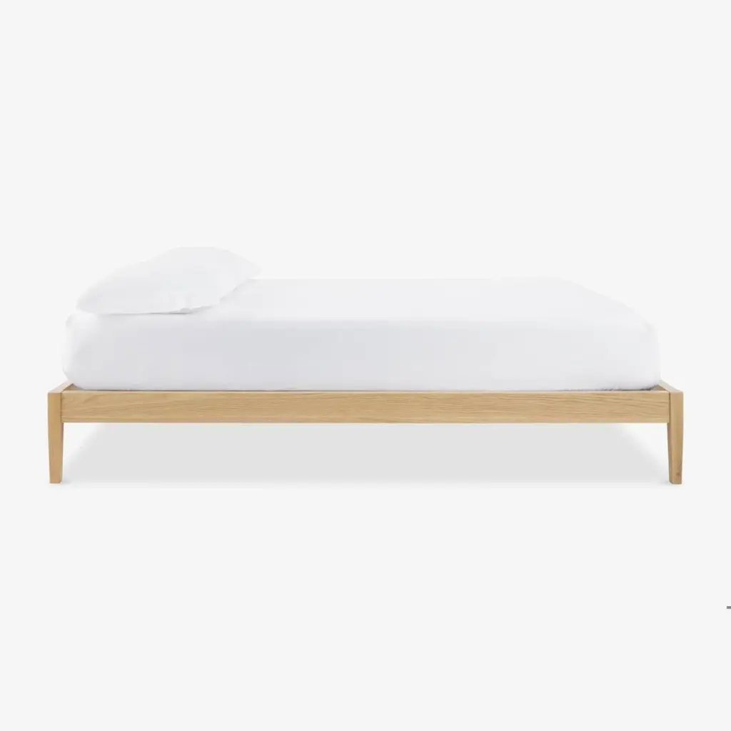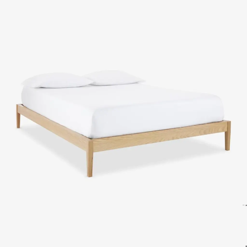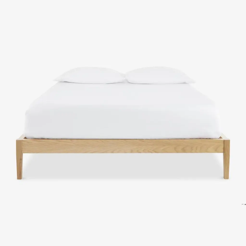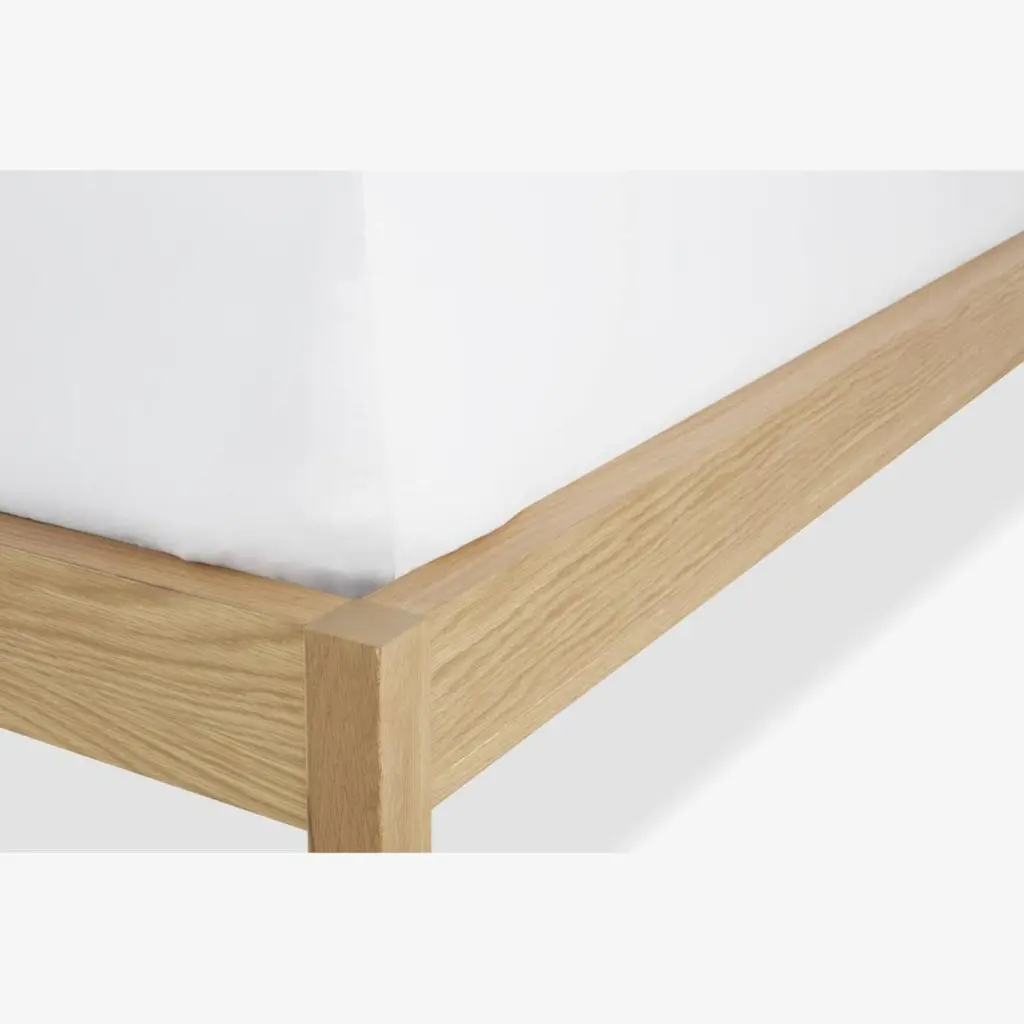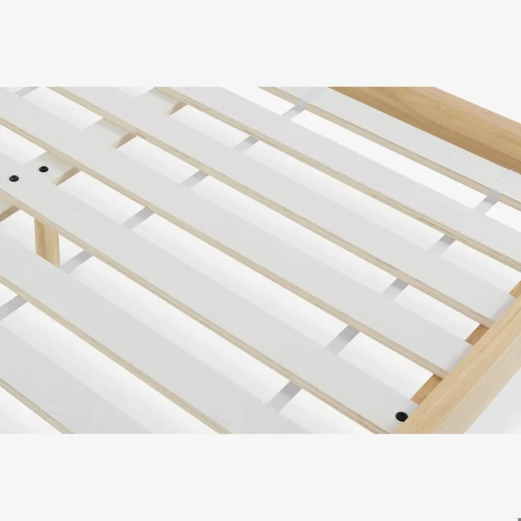 The Thompson is a quintessential option that won't steer you wrong. The light oak and dark walnut finishes deliver a minimalist look for this bed frame. Bed clearance 8". Distance between slats 3". Mattress not included.