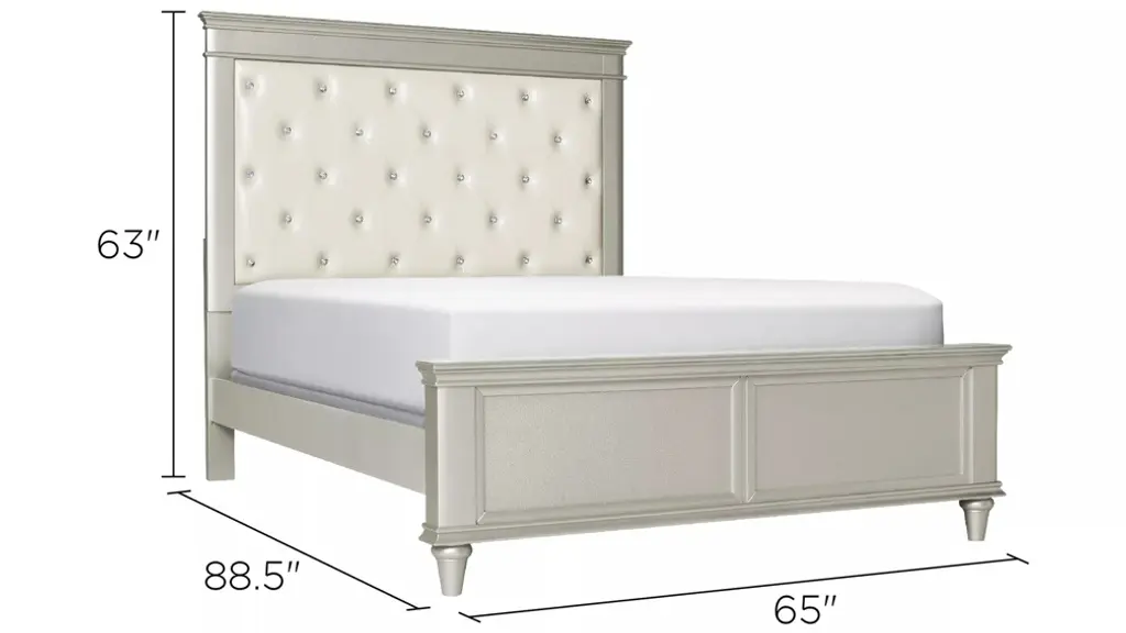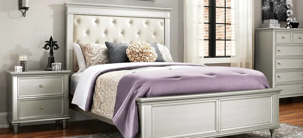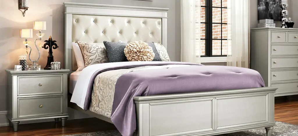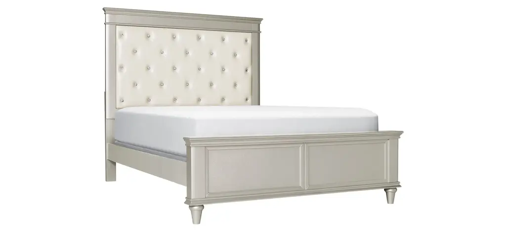 Make your bedroom look glamorous with the Tiffany Upholstered Bed. Its Hollywood-inspired design is truly dazzling with its crystal-look tufting and stunning silver finish. The cream-colored, leather-look upholstery is so stylish, plus provides a place to rest your head while reading or watching TV. Faux snakeskin accents adorn the trim for even more flair.