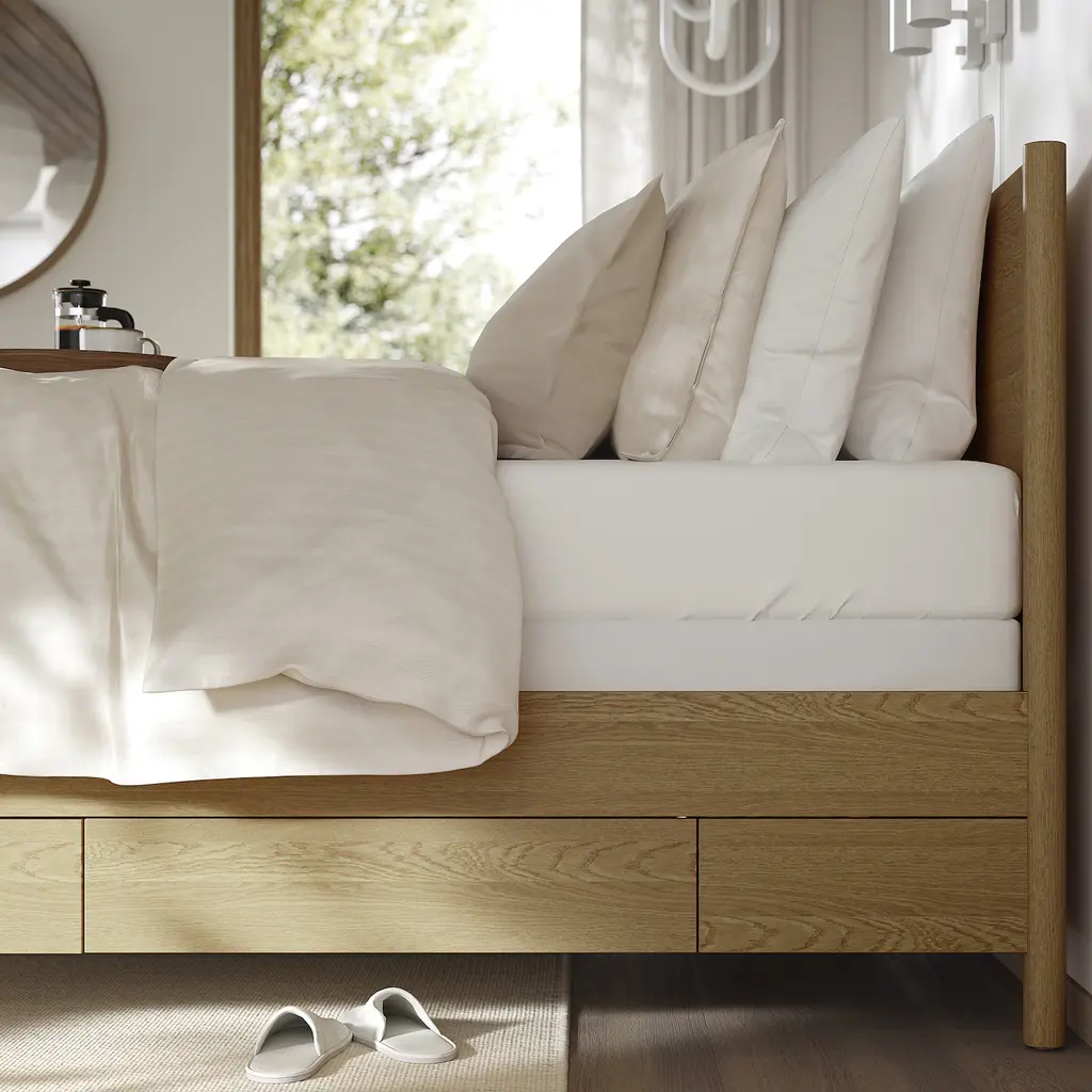 TONSTAD Bed frame with storage - oak veneer/Lyngör white Full. 4 spacious drawers under the bed make the best use of the space. They are great for storing extra duvets, pillows and bed linens – or your clothes. The drawers close silently and softly thanks to the integrated soft-closing function.