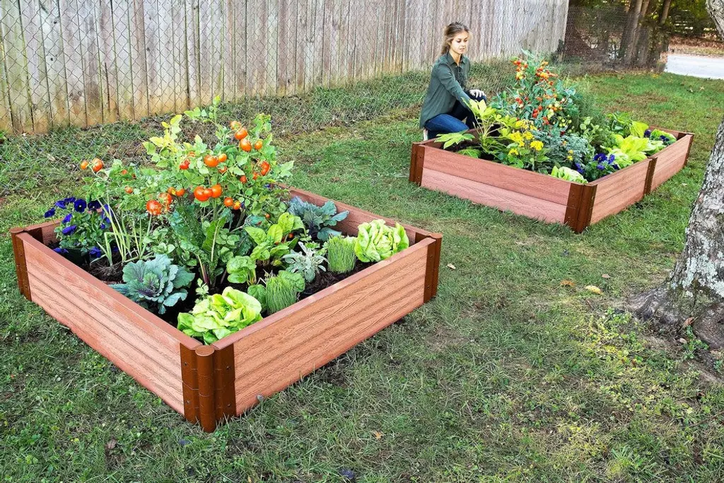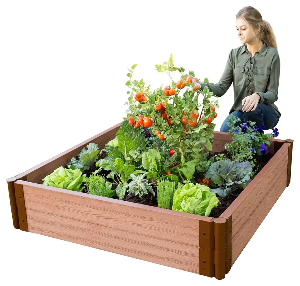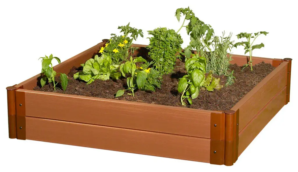 Looking for a small garden that delivers on looks, functionality and flexibility? This two-level raised garden bed has got you covered. As pictured, your 11-inch-high raised garden gives you lots of depth to grow both underground veggies like carrots, radishes and turnips, as well as tall plants like tomatoes, corn or sunflowers. With 16 square feet of available planting area this is a great starter garden for you to build on. Tool-free snap-lock joints make it simple to install.Your kit comes with everything you need except the soil and plants. Each modular kit includes eight of our 2� Classic Sienna composite boards, and eight 2� snap-lock stacking brackets. The insulating open-channel boards trap air, providing insulation to your soil. Keeps soil warmer in the Spring and Fall, and cooler in the Summer, so you can grow for an extended period. Stacking brackets allow you to install the second layer of your garden just by inserting the stakes into the brackets below.Our patented snap-lock brackets simply slide onto each end of a board and fasten securely with snap-lock buttons. Brackets pivot 270 degrees, allowing endless design options. Want a diamond shape instead of a square? No problem! Simply adjust the angles on opposing sides. Planning to grow flowers that don�t need the additional depth of an 11-inch-high garden? You can convert your kit into two 5.5-inch-high raised beds, increasing your available planting are to 32 square feet.As your garden needs and expertise grow you can add on to your modular raised bed any time by purchasing additional 2� tool-free kits, boards or brackets to stack or extend your garden. Curved 2� boards are also available to incorporate into your design.Did you know? You can grow up to 16 different plants inside your 4� x 4� garden using �Square Foot Gardening� techniques. There are countless books and online resources available to guide you in this rewarding method of gardening.