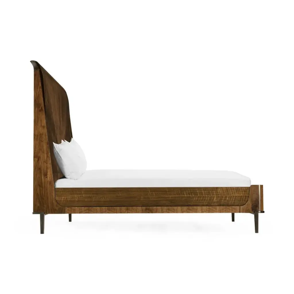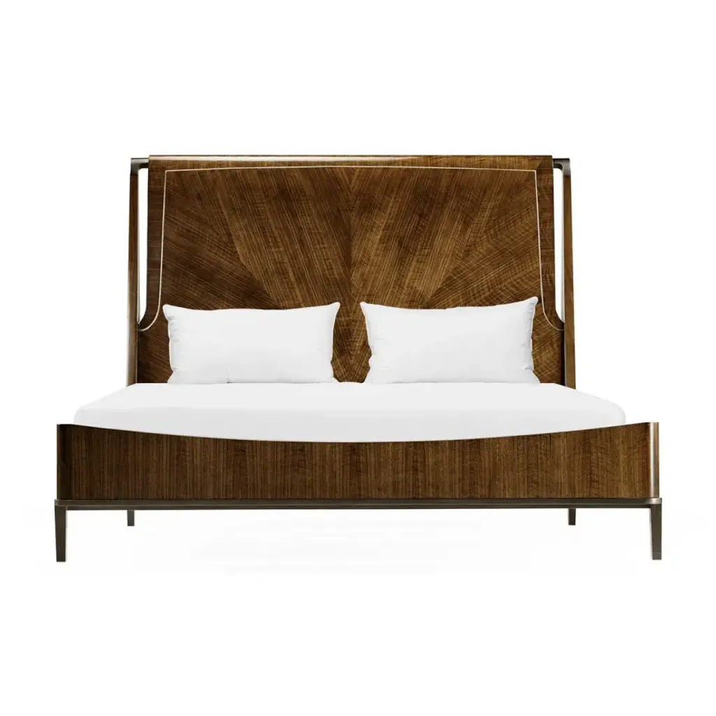 500353-USK-WTL Bed frame is constructed of American walnut. Headboard features figured walnut veneer with a hand rubbed lacquer finish. Side rails and foot board display figured walnut veneer. Structure rests on brass metal work.