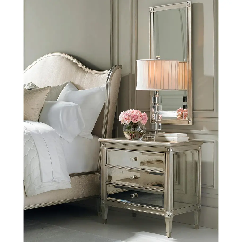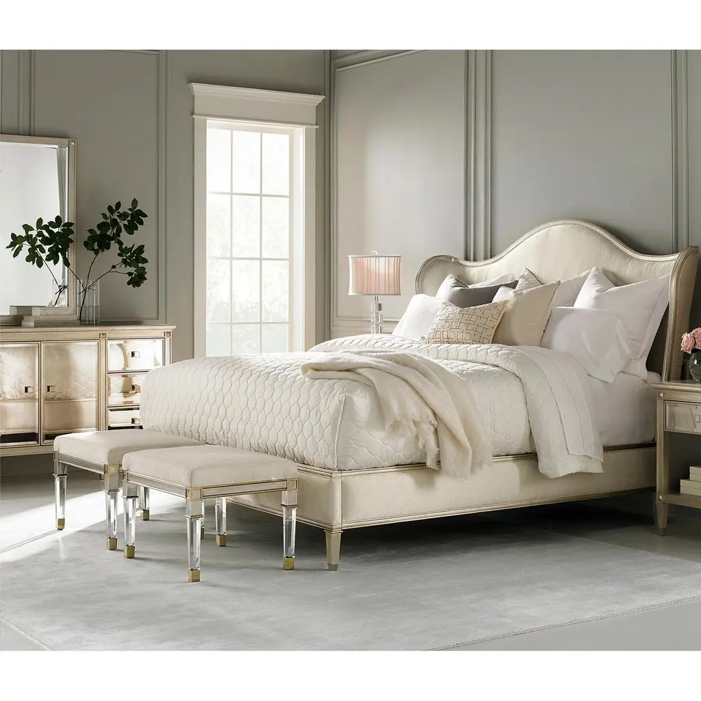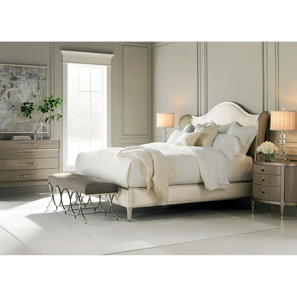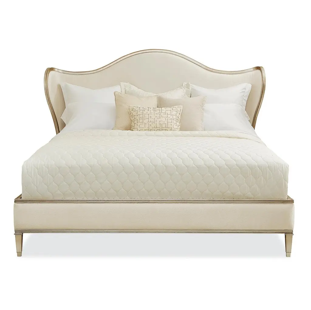 A Transitional Style Upholstered King Bed with a serpentine headboard and curved wings. The exposed carved wood rail is finished in radiant Auric silver leaf. Fully upholstered in a cream fabric. This piece has a low footboard and square-tapered carved feet.Dimensions: 90.5" W x 90.5" D x 65" H