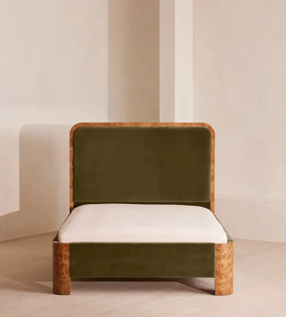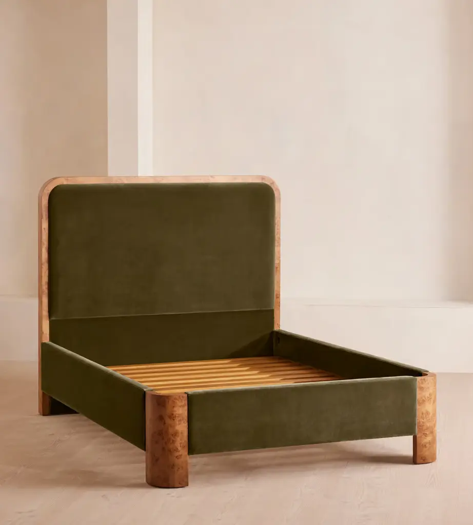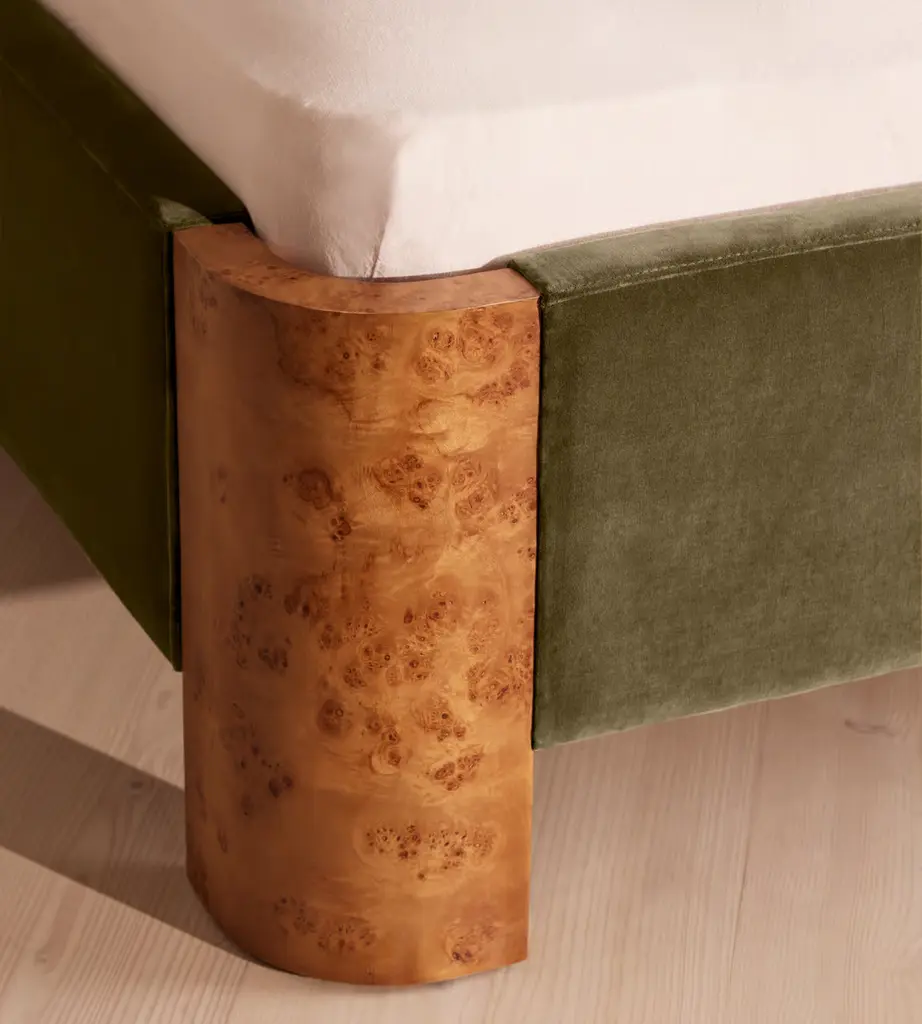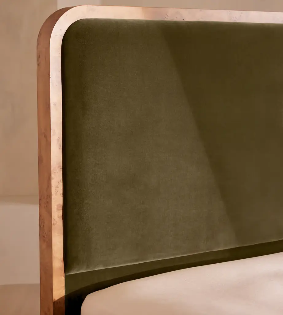 As seen in Soho House Nashville, the Tremont bed features a sculptural Mappa burl frame in a warm mid-tone finish and linen upholstery, turning the headboard into a defining design element. Burl detail to the back means this particular style can float within a space and work as a room divider.