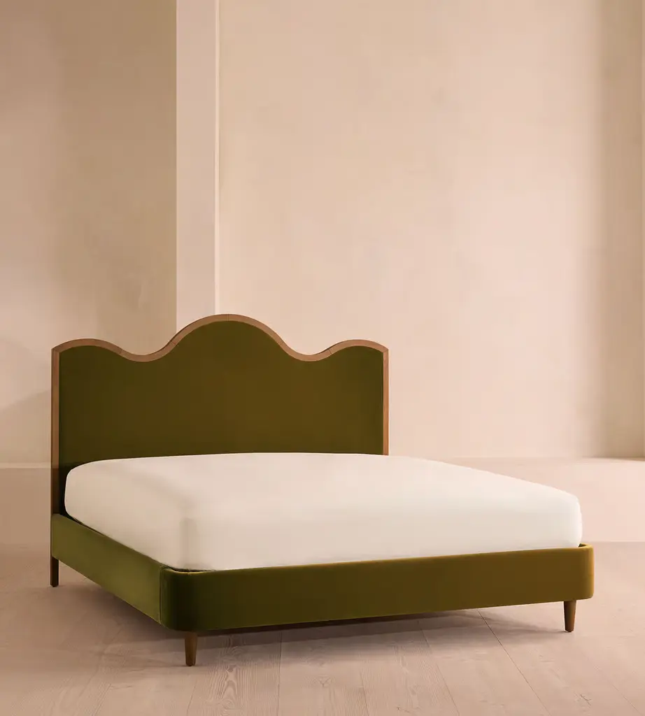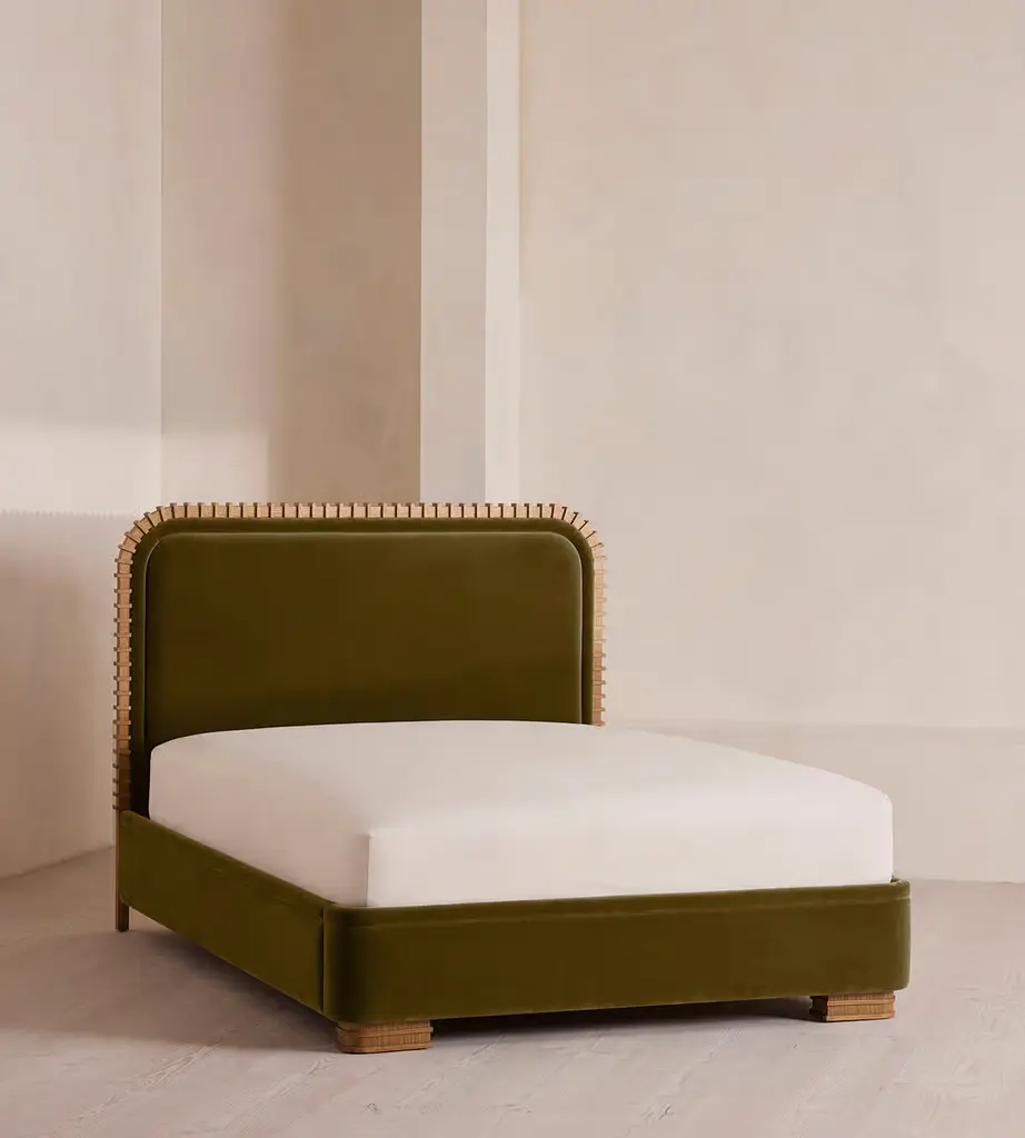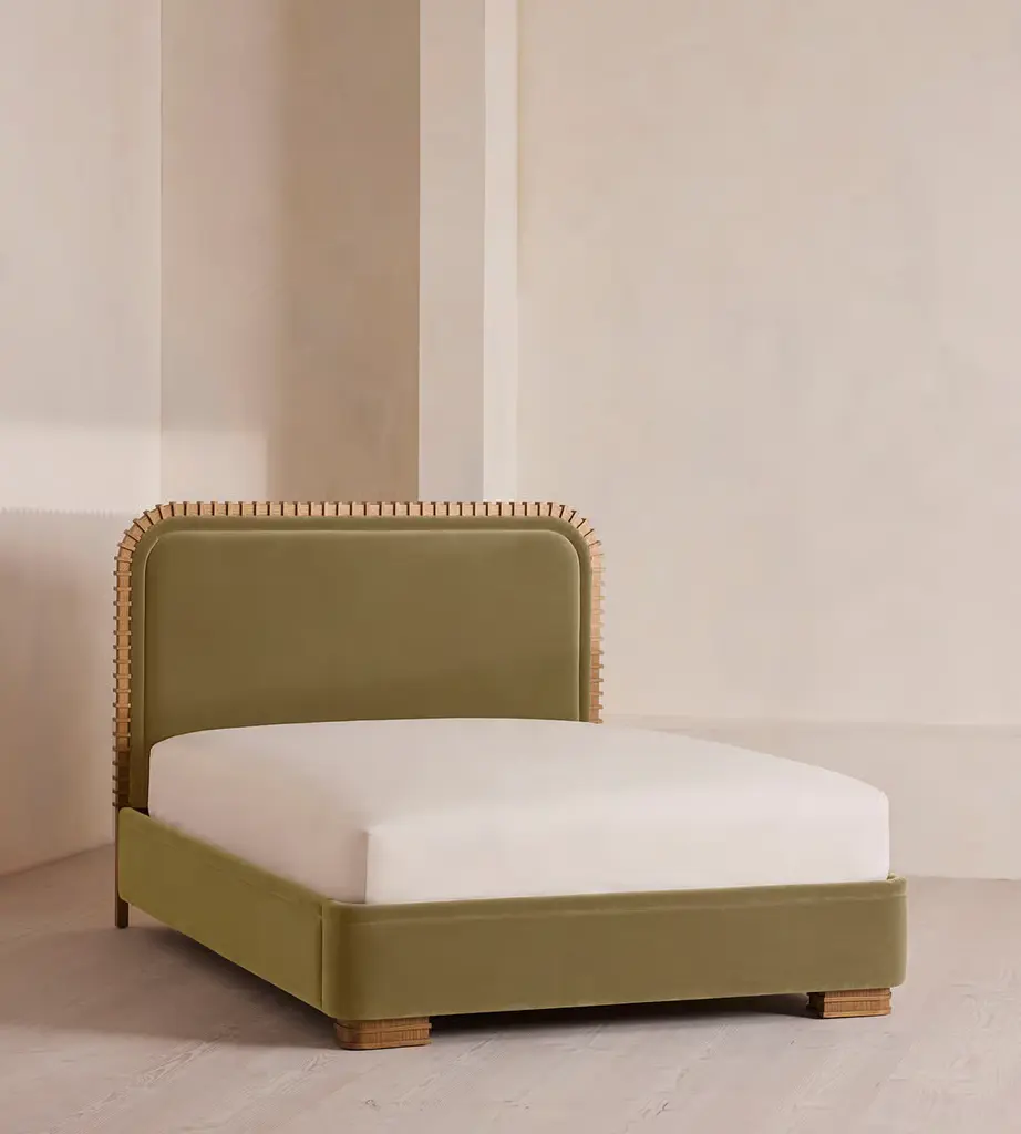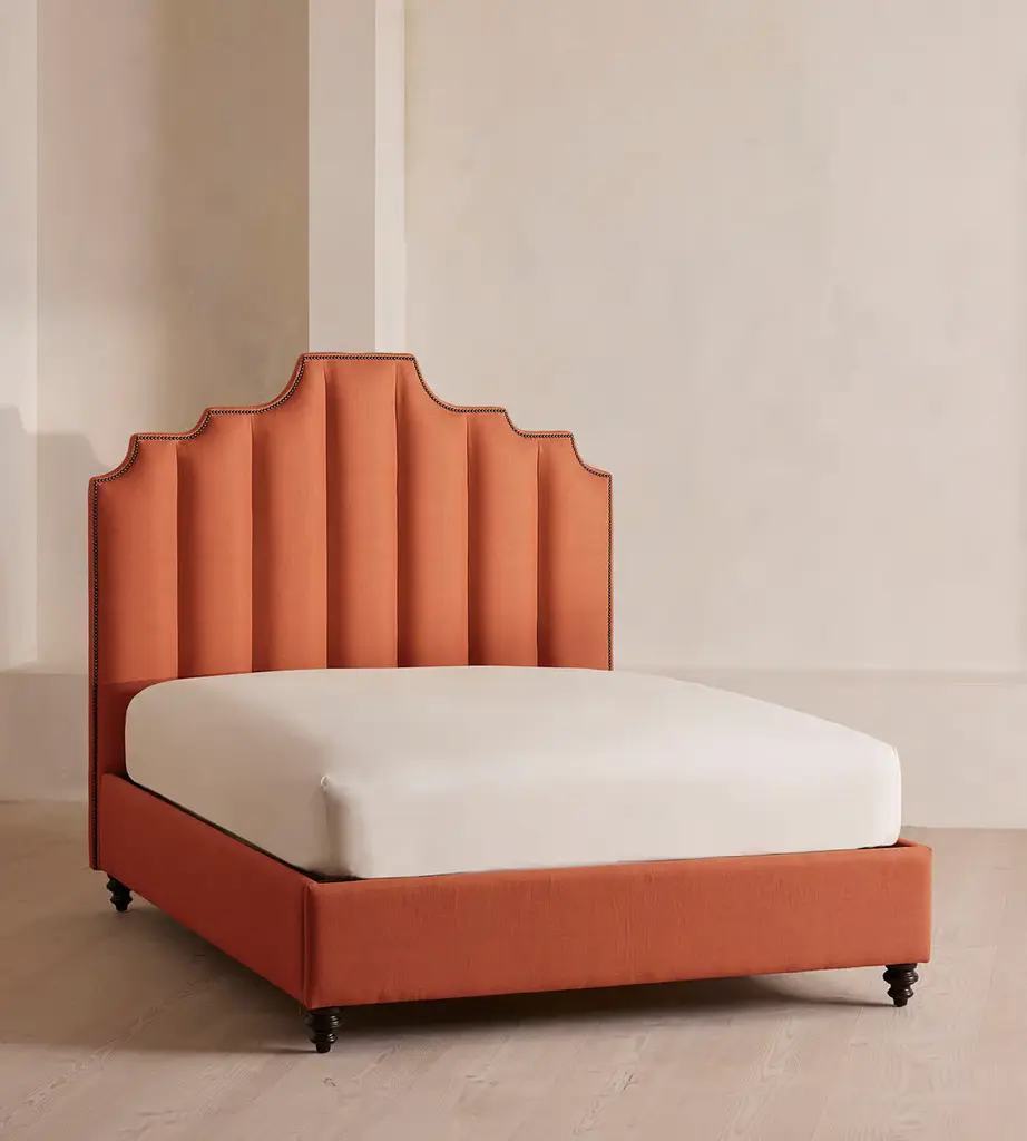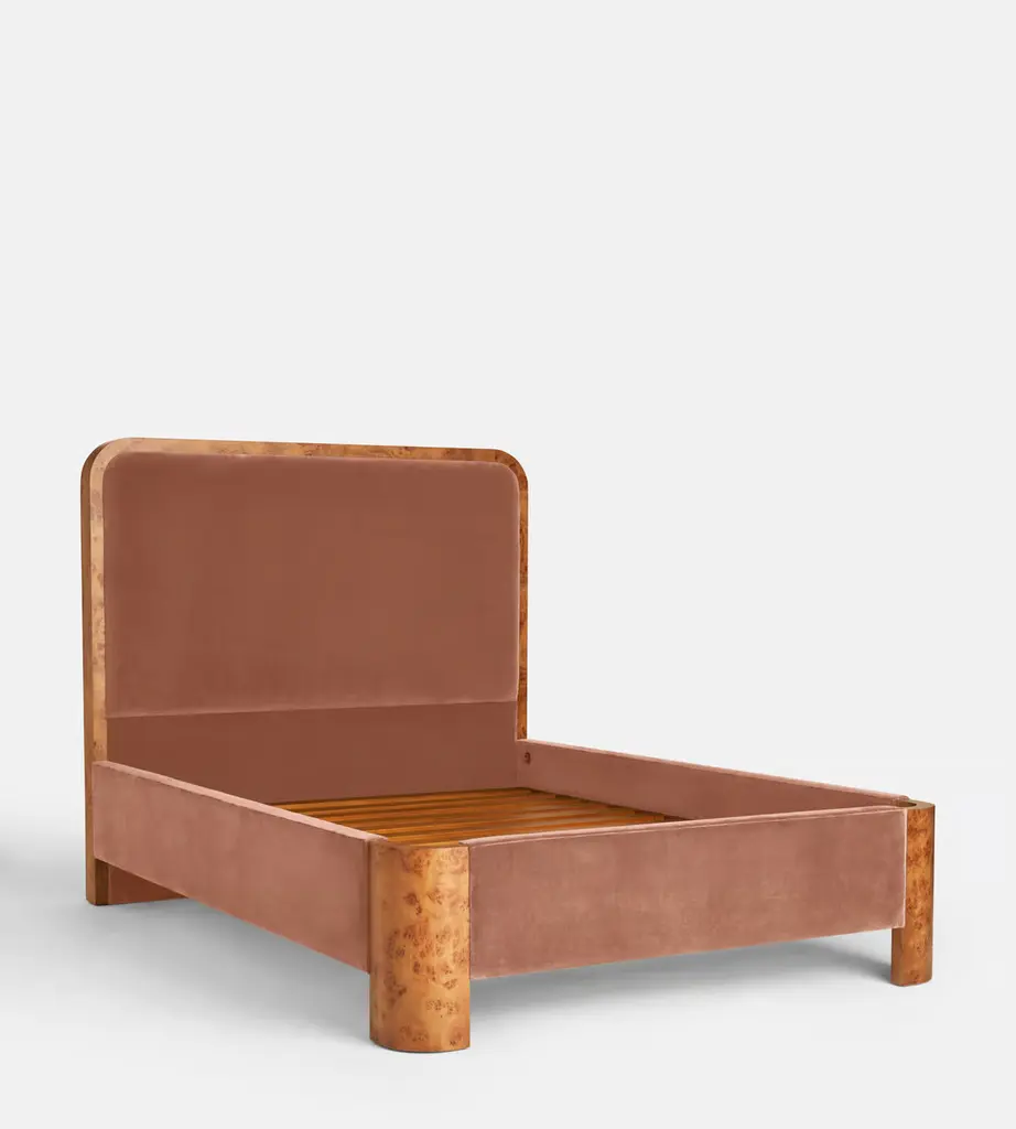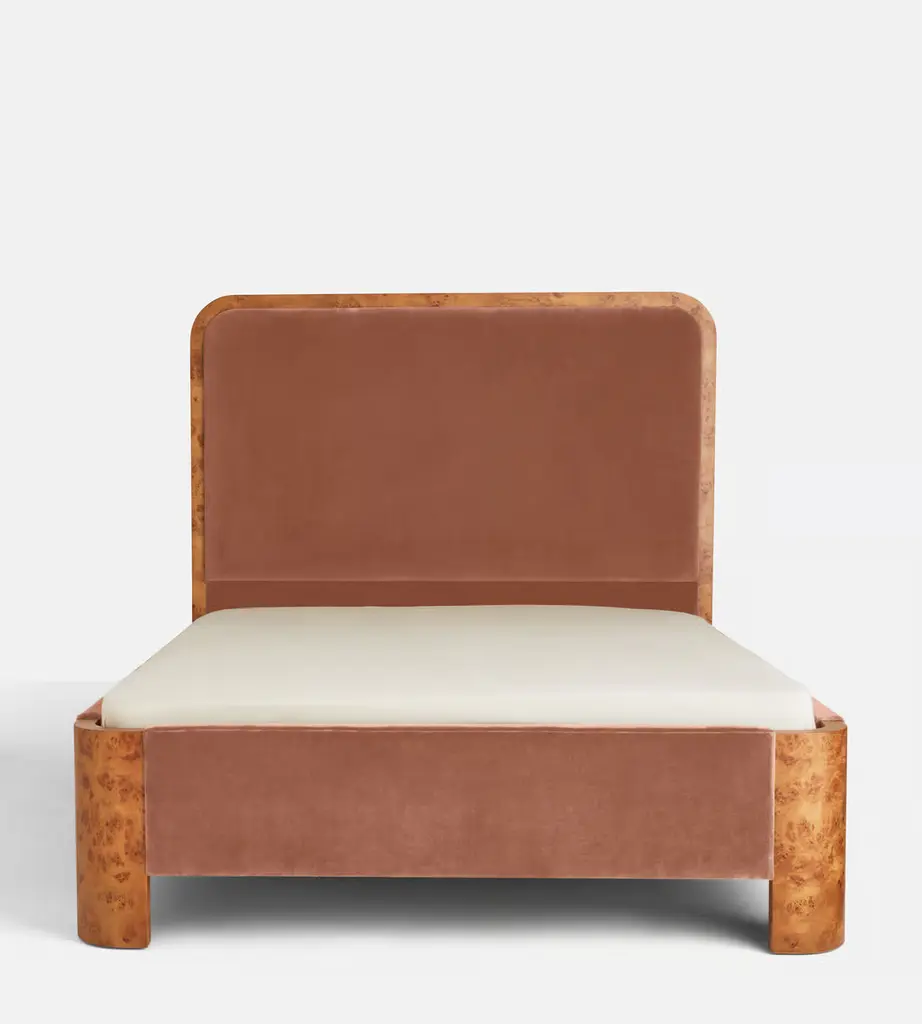 As seen in Soho House Nashville, the Tremont bed features a sculptural Mappa burl frame in a warm mid-tone finish and linen upholstery, turning the headboard into a defining design element. Burl detail to the back means this particular style can float within a space and work as a room divider.