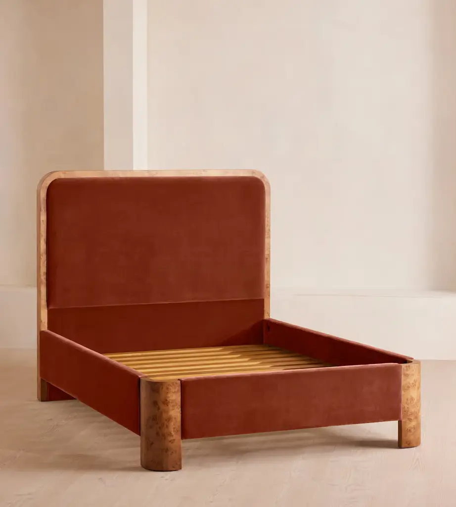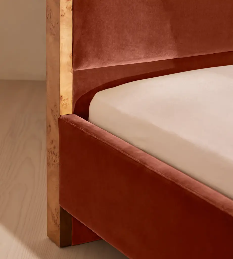 As seen in Soho House Nashville, the Tremont bed features a sculptural Mappa burl frame in a warm mid-tone finish and linen upholstery, turning the headboard into a defining design element. Burl detail to the back means this particular style can float within a space and work as a room divider.