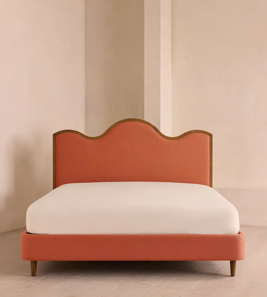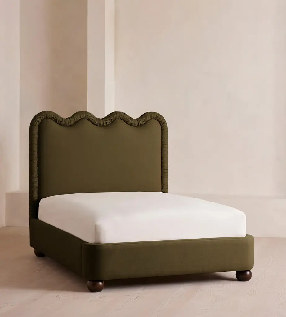 An oversized wavy headboard is fully upholstered and finished with ruched detailing. Taking inspiration from the vintage interiors seen in Soho House Paris, our statement Tristan bed features a low profile and a comfy cushioned headboard, all resting on solid birch ball feet, fully upholstered in velvet or linen.