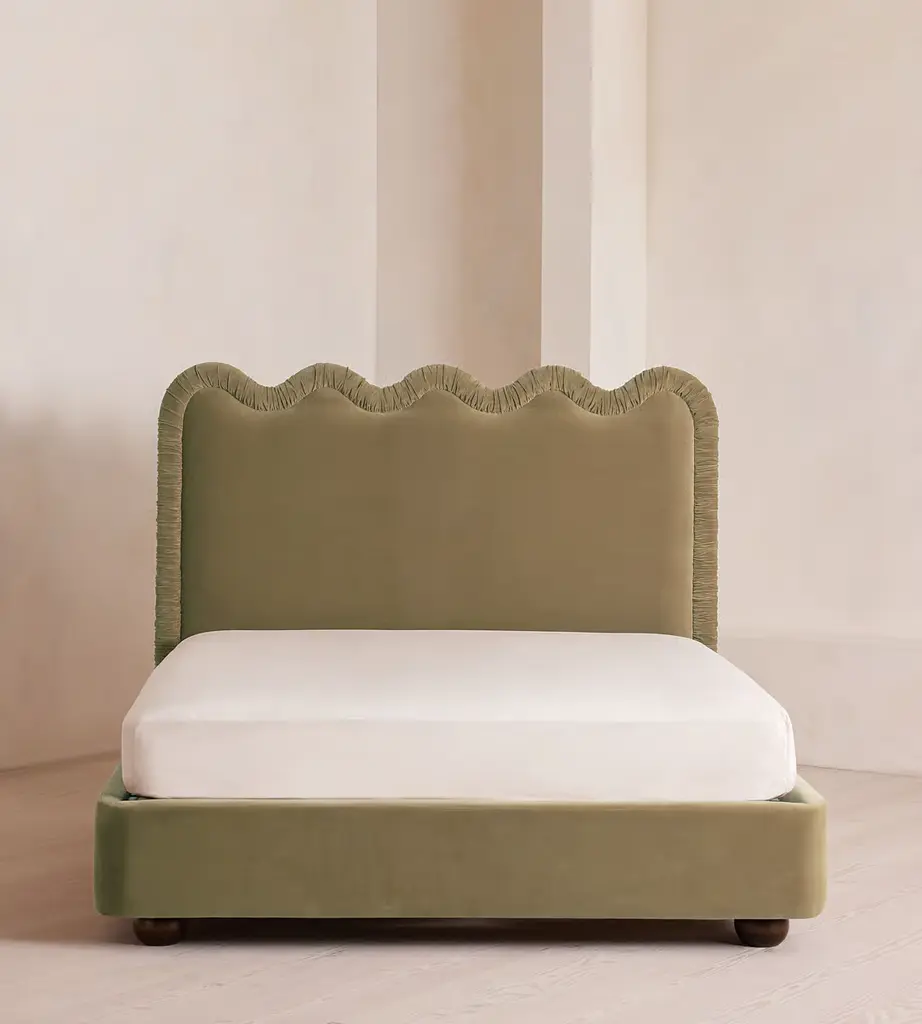 An oversized wavy headboard is fully upholstered and finished with ruched detailing. Taking inspiration from the vintage interiors seen in Soho House Paris, our statement Tristan bed features a low profile and a comfy cushioned headboard, all resting on solid birch ball feet, fully upholstered in velvet or linen.