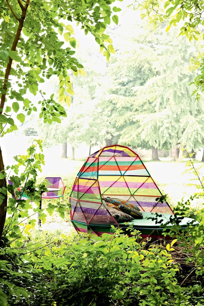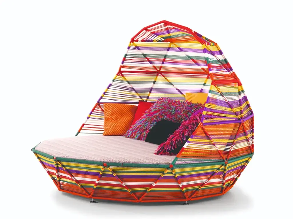 Tropicalia has a multicolored polymer cord woven on frame. Frame is red RAL 3020 painted steel. Cushions are polyester fiberfill and day bed mattress is polyurethane foam; suitable for outdoor use. The product is completed with pillows (included):n. 2 pillows cm 40x40n. 2 pillows cm 52x28n. 3 pillows cm 57x57The tubular steel frame of Antibodi becomes the starting point which the designer uses for a creative makeover. The frame is disguised and transformed, the seats assume different personalities according to the material used. The wrapping of thread works like pencil lines, creating a surface which is both graphic and structural, both part of its construction and a form of identity: playful when two or three colours are used, sophisticated in a single colour, elegant in leather.NOTE:- Natural and artificial leather versions are not suitable for outdoor use.