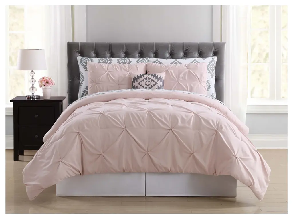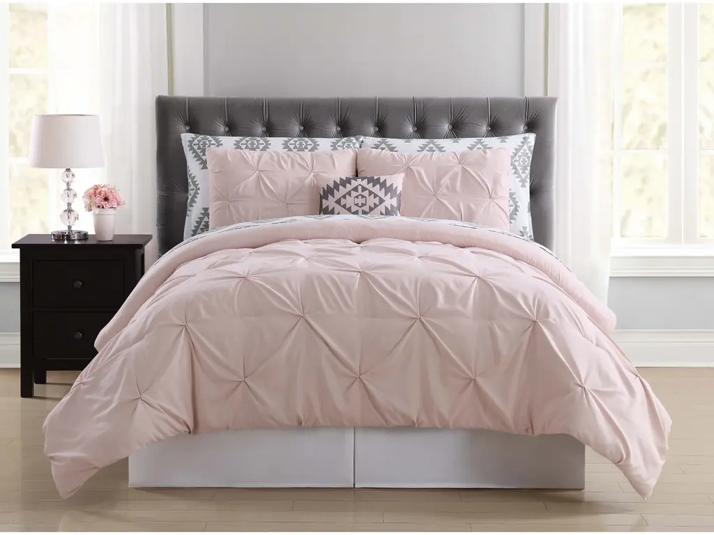 Poised yet playful, this ensemble adds a touch of romance to any space. Softly textured pleats on the comforter pair beautifully with southwest patterned sheets to create an air of effortless indulgence in an on-trend color palette. Toss in the charming accent pillow to complete the look.