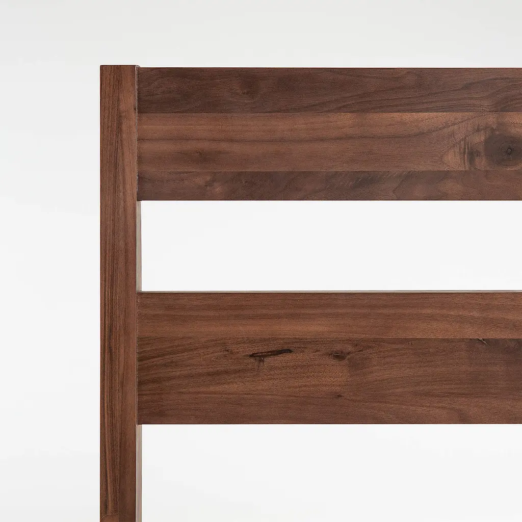 Solid walnut crafts an heirloom-worthy platform bed with thoughtful details and a modern design that looks clean and classic. Expertly constructed of high-quality, long-lasting hardwood, the queen bed features a headboard with slats carefully spaced to prevent pillows from falling through. The legs are intentionally placed to stay out of the way of feet and toes, and the bed's seven-inch bottom clearance accommodates most under-bed storage bins. We love how the natural wood finish complements bedroom decor of any style and looks amazing with any of our bed linens. Available only at Crate and Barrel and Tuft & Needle.