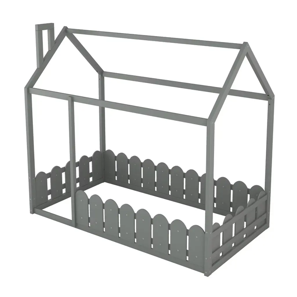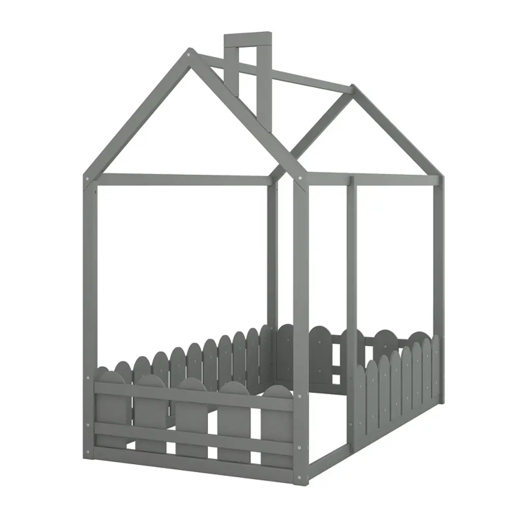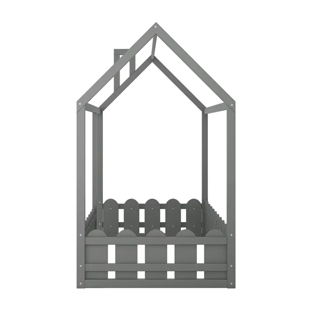Product Features [Playhouse Design]: Featuring roof and fence, this unique bed creates a fun and adorable space that not only serves as a comfortable sleeping area but also doubles as a space for your kids to play and have fun.[A Better Sleeping Environment]: Thanks to the semi-enclosed space, your kids will have their own sleeping space that affords a comforting atmosphere for better sleep while not sacrificing air circulation.[Superior Quality]: The twin size house bed is constructed with a sturdy pinewood frame that can enhance stability and durability. Slats are not included — you need to prepare box springs or foundations.[Dimensions]: Overall bunk bed dimension: 78.7” x 41” x 70.5” (L x W x H). Weight capacity: no limit. This wood house bed will come in 1 package with clear instructions and hardware. Description Featuring roof and fence, this bed doubles as a semi-enclosed play place perfect for kids to study, watch TV or explore their imaginations. With fence and a sturdy pine frame, this bed offers a safe space for your kids to get a good nights sleep. Weight & Dimensions Overall Product Dimension: 78.7"L x 41"W x 70.5"HDetail Product Dimension: Please refer to the Size imageNumber of Package: 1Package Dimension: Please refer to the SpecificationOverall Product Weight: 77 LBSPackage Weight: Please refer to the SpecificationWeight Capacity: No limitRecommended Mattress Thickness: 6" - 8" Specifications Product Type: House BedSize: TwinMaterial: Plywood + MDF + PinewoodBox Spring Required: YesNumber of Slats: Slats are not includedAssembly Required: Yes