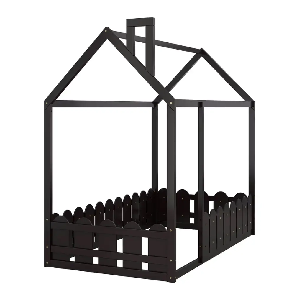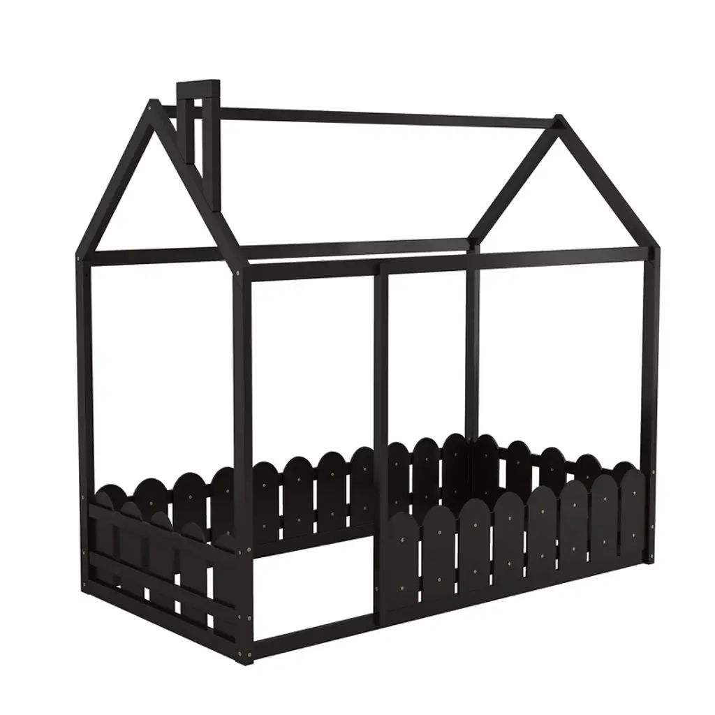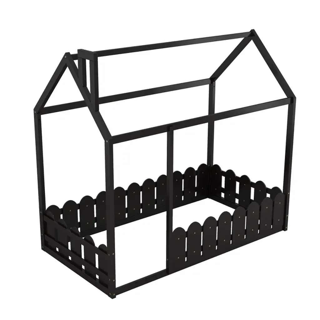 Product Features [Playhouse Design]: Featuring roof and fence, this unique bed creates a fun and adorable space that not only serves as a comfortable sleeping area but also doubles as a space for your kids to play and have fun.[A Better Sleeping Environment]: Thanks to the semi-enclosed space, your kids will have their own sleeping space that affords a comforting atmosphere for better sleep while not sacrificing air circulation.[Superior Quality]: The twin size house bed is constructed with a sturdy pinewood frame that can enhance stability and durability. Slats are not included — you need to prepare box springs or foundations.[Dimensions]: Overall bunk bed dimension: 78.7” x 41” x 70.5” (L x W x H). Weight capacity: no limit. This wood house bed will come in 1 package with clear instructions and hardware. Description Featuring roof and fence, this bed doubles as a semi-enclosed play place perfect for kids to study, watch TV or explore their imaginations. With fence and a sturdy pine frame, this bed offers a safe space for your kids to get a good nights sleep. Weight & Dimensions Overall Product Dimension: 78.7"L x 41"W x 70.5"HDetail Product Dimension: Please refer to the Size imageNumber of Package: 1Package Dimension: Please refer to the SpecificationOverall Product Weight: 77 LBSPackage Weight: Please refer to the SpecificationWeight Capacity: No limitRecommended Mattress Thickness: 6" - 8" Specifications Product Type: House BedSize: TwinMaterial: Plywood + MDF + PinewoodBox Spring Required: YesNumber of Slats: Slats are not includedAssembly Required: Yes